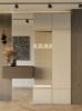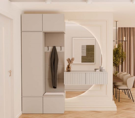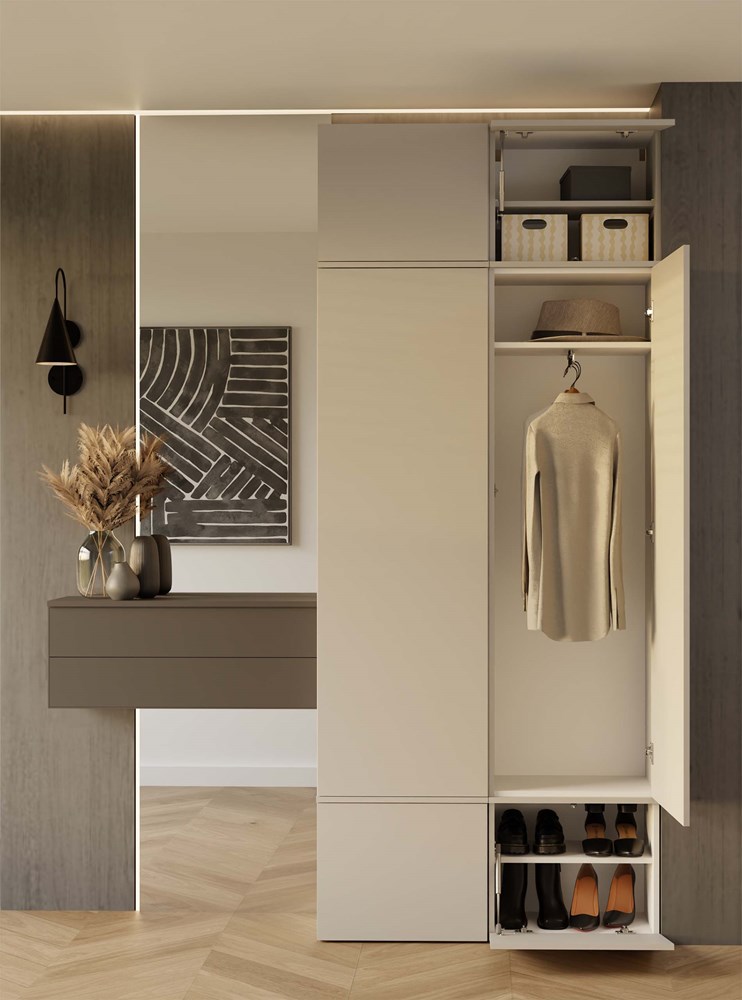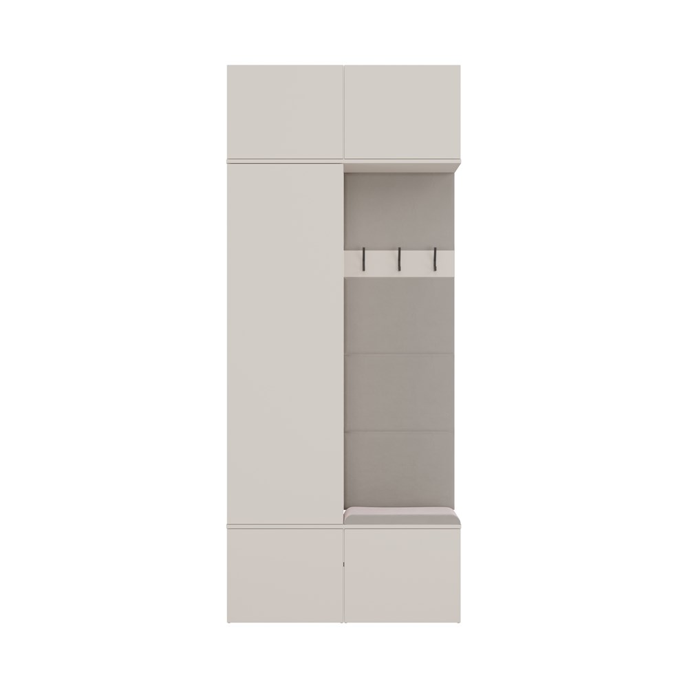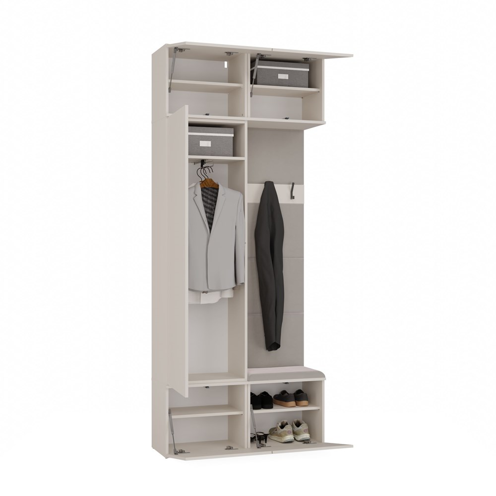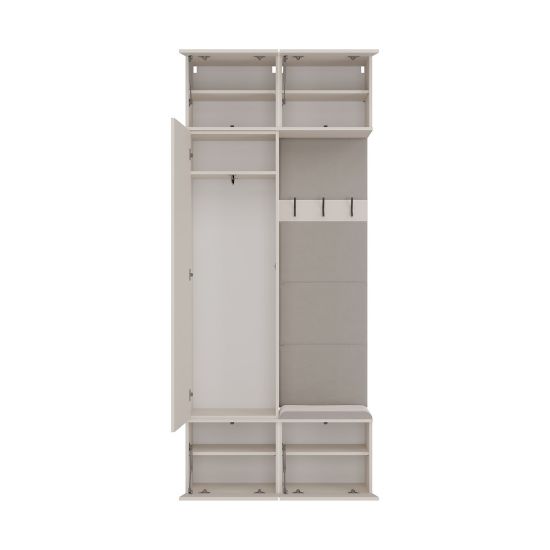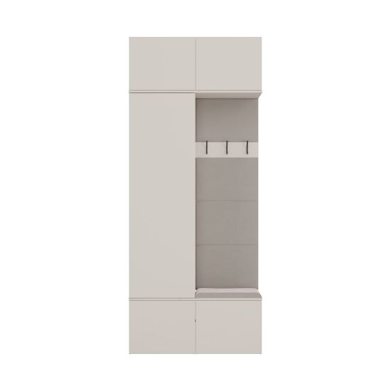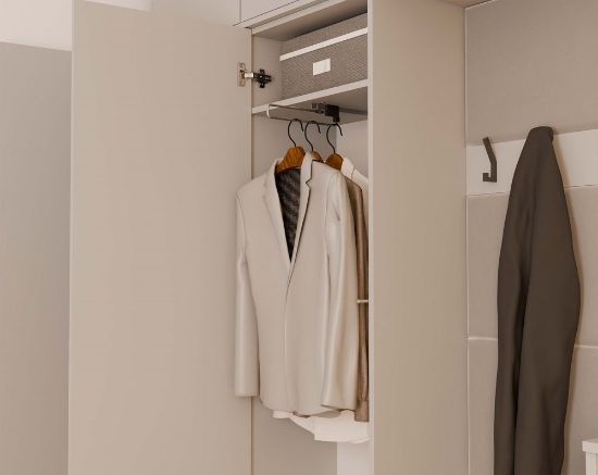 W zamykanej szafie znajduje się drążek na odzież wierzchnią, dzięki czemu kurtki i płaszcze można wygodnie zawiesić i chronić przed zagnieceniem. Obok niej znajduje się tapicerowane siedzisko, które nie tylko podnosi komfort ubierania się, ale skrywa także praktyczną szafkę na buty.