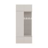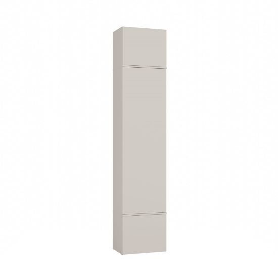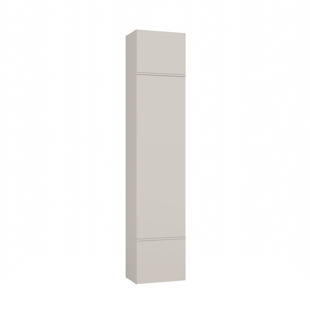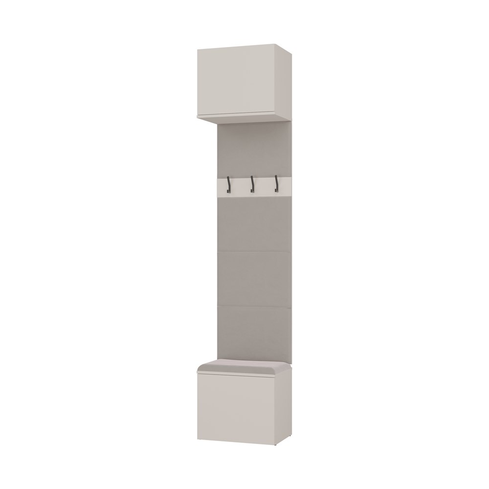 Stonowany odcień kaszmiru nadaje meblowi elegancki, nowoczesny charakter, który doskonale wpisuje się w aranżacje w stylu minimalistycznym lub skandynawskim. Korpus wykonany z trwałej płyty laminowanej o grubości 16 mm zapewnia wytrzymałość, a gładkie fronty bez uchwytów, wyposażone w system TIP-ON, podkreślają nowoczesny wygląd mebla i ułatwiają codzienne użytkowanie. Tapicerowane elementy oraz czarne, plastikowe haczyki dopełniają funkcjonalność i estetykę całej konstrukcji.