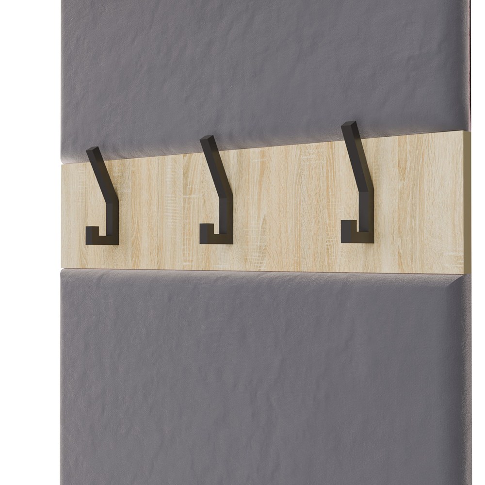 Zamiast klasycznej zabudowanej szafy, garderoba Hamar oferuje otwarty wieszak z czarnymi plastikowymi haczykami, które umożliwiają szybki dostęp do kurtek, toreb i plecaków – idealne rozwiązanie do codziennego użytkowania. Dzięki kompaktowej budowie, mebel doskonale sprawdzi się zarówno w mniejszych przedpokojach, jak i większych holach, zachowując optyczną lekkość wnętrza.