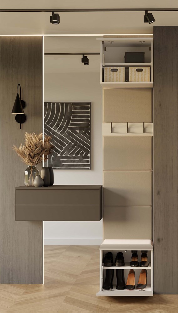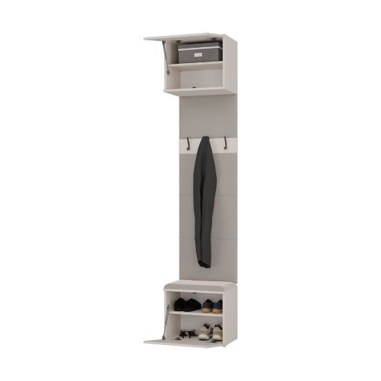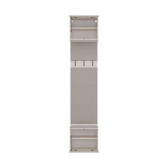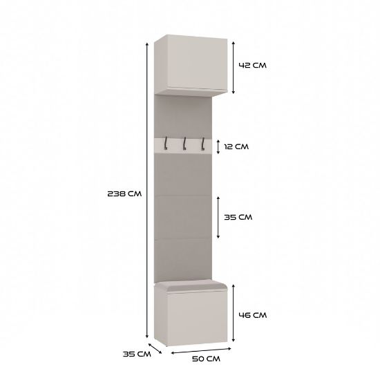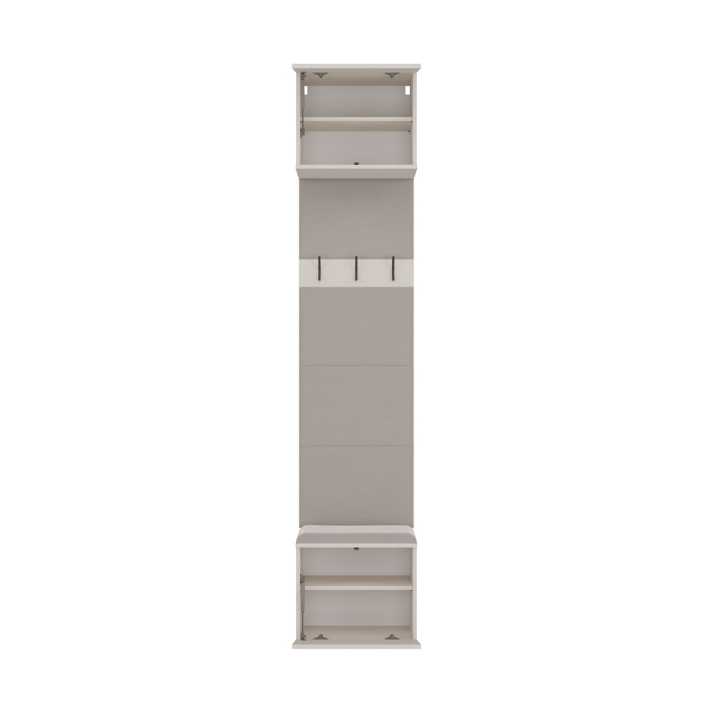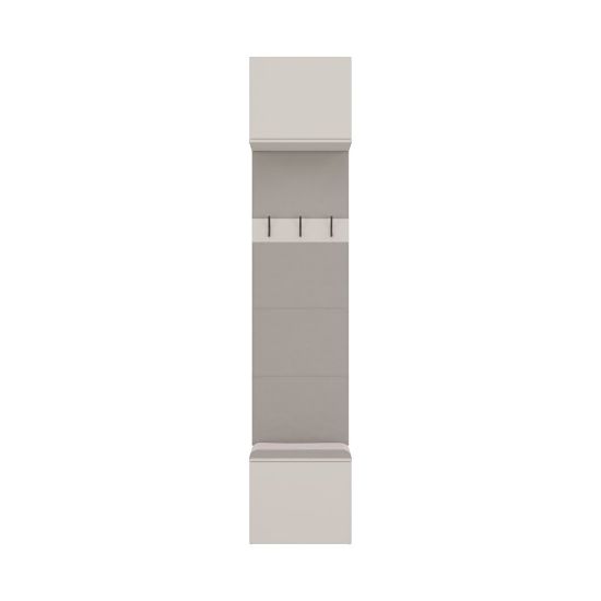 Garderoba Hamar to nowoczesne i praktyczne rozwiązanie do przedpokoju, które łączy kompaktowy rozmiar z maksymalną użytecznością. Została zaprojektowana z myślą o użytkownikach ceniących porządek, wygodę oraz minimalistyczny styl. W skład zestawu wchodzi wygodne siedzisko z miejscem do przechowywania, otwarty panel z wieszakami oraz pojemna szafka górna.