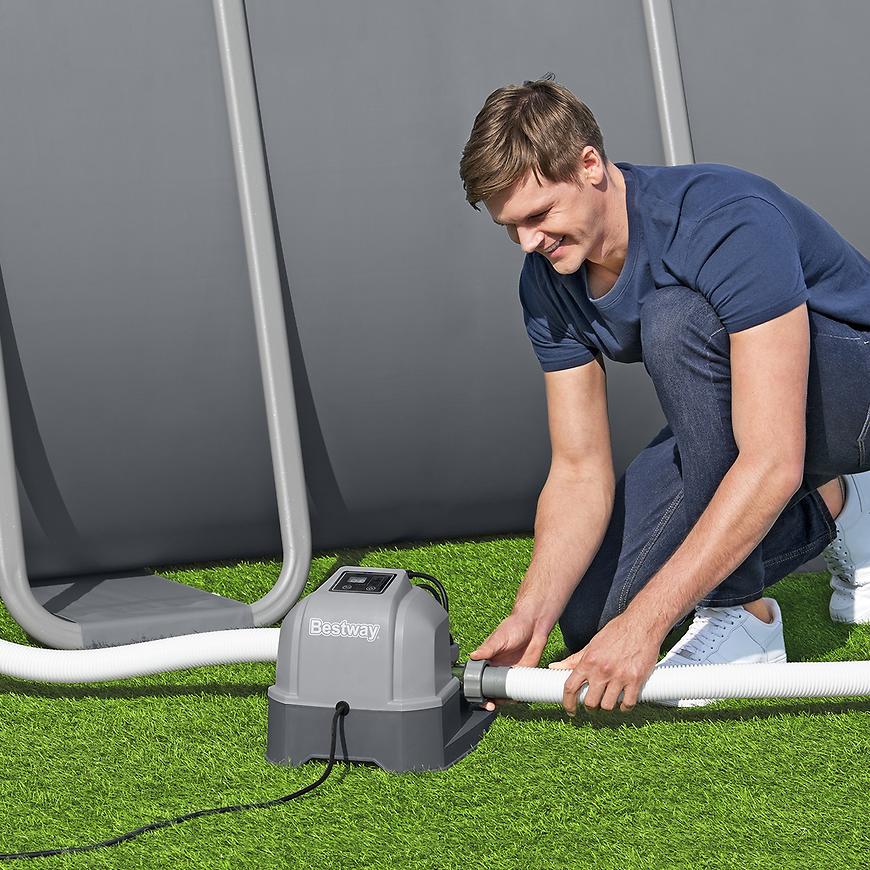 Obsługa i konserwacja systemu są niezwykle proste, dzięki automatycznemu trybowi samoczyszczenia. Ustaw zegar, a resztę pozostaw systemowi! Panel z ekranem dotykowym zapewnia szybkie i łatwe sterowanie, a dioda LED sygnalizuje ewentualne problemy. W razie potrzeby, nasza obsługa klienta Bestway jest zawsze dostępna, zapewniając pełną pewność, że Twój basen zawsze będzie gotowy do relaksu. Ciesz się klarowną wodą, komfortem i oszczędnością dzięki Hydrogenic™ - rewolucji w utrzymaniu basenu.