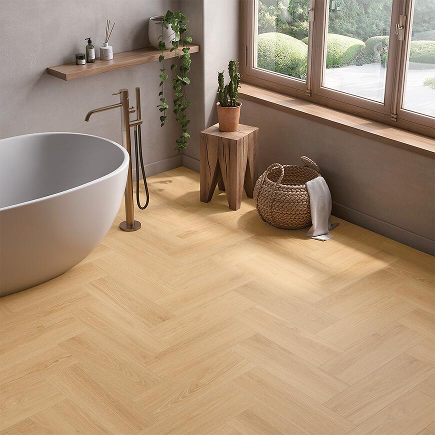 Uniwersalne zastosowanie płytki Gironde Chevron Miel Mat