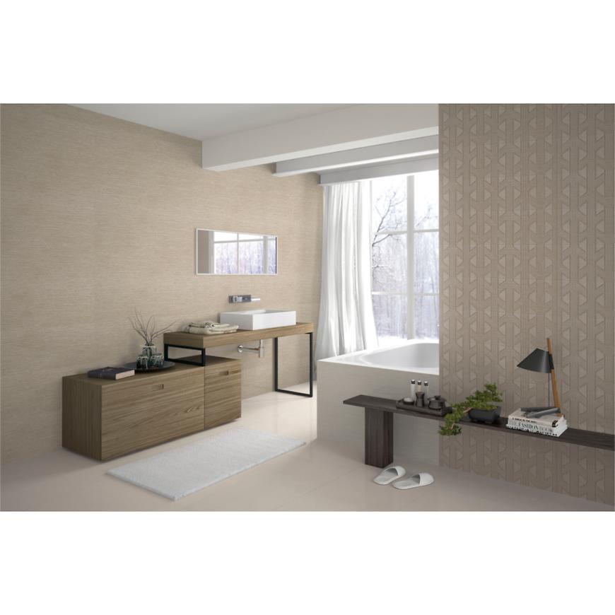Format 25/75 nadaje ścianie proporcji dłuższego modułu. To format, który zapewnia wizualną ciągłość, a przy układaniu strukturą poziomo – daje bardziej stonowany, elegancki rytm. Rektyfikacja wprowadza dodatkowo możliwość prowadzenia wąskiej fugi, co w praktyce bardzo mocno poprawia odczyt struktury płytki na ścianie. W efekcie zamiast siatki podziałów widzimy płaszczyznę, która gra fakturą i kolorem.