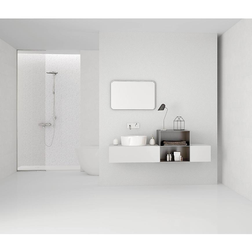 Glazura Craft blanco 25/75 rekt to bazowa glazura ścienna w kolorze bieli o estetyce betonu. Biel w tym wydaniu jest bardzo współczesna – nie kredowa ani chłodna, lecz neutralna i dopracowana do pracy z architekturą wnętrza i światłem. To płytka, która nie wnosi graficznego chaosu. Tworzy płaszczyznę czystą, przewiewną wizualnie i idealnie podatną na zestawianie z drewnem, naturalną teksturą kamienia czy metalem.