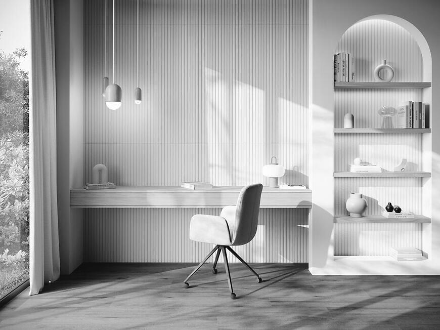 Matowe wykończenie glazury Devon Blanco nadaje ścianie spokojny, szlachetny wygląd i podkreśla subtelność marmurowego wzoru. Rektyfikowane krawędzie umożliwiają precyzyjne ułożenie płytek z wąską fugą, co sprzyja uzyskaniu spójnego i eleganckiego efektu.