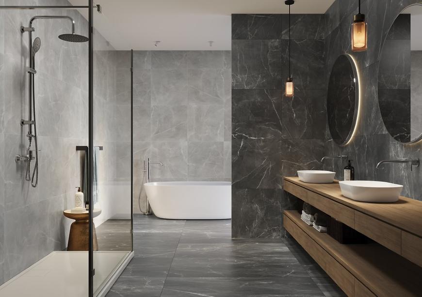 Gres Ambrosio to wysokiej jakości płytka bazowa o wymiarach 119,7×59,7 cm, grubości 0,7 cm, przeznaczona zarówno na podłogi, jak i ściany. Jej grafitowy kolor oraz matowa powierzchnia w naturalny sposób nawiązują do elegancji marmuru, wprowadzając do wnętrz i przestrzeni zewnętrznych nowoczesny i harmonijny design. Dzięki rektyfikacji krawędzi, płytki umożliwiają tworzenie minimalistycznych, niemal bezfugowych aranżacji, co sprawia, że każda podłoga lub ściana zyskuje jednolity, estetyczny wygląd.