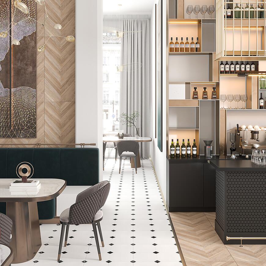 Płytka bazowa Gres Avigion Black-White o wymiarach 58x58 cm doskonale sprawdza się zarówno na podłodze, jak i ścianie. Jej uniwersalny charakter umożliwia tworzenie eleganckich aranżacji w domach, biurach i przestrzeniach komercyjnych. Odporność na zmienne warunki atmosferyczne pozwala zastosować ją również na tarasach i balkonach.