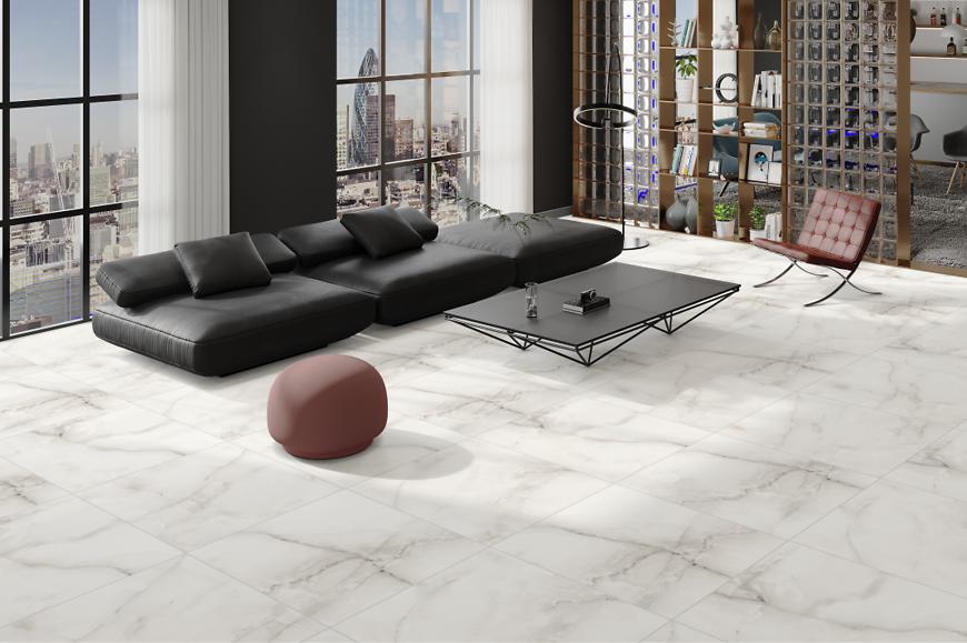 Duży format 60 × 60 cm pozwala uzyskać jednolite powierzchnie z minimalną liczbą fug