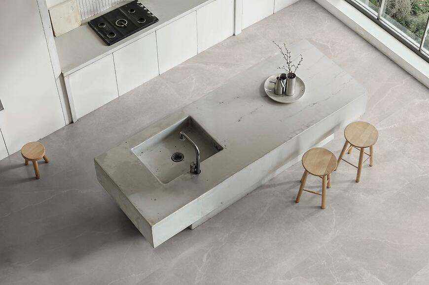 Duży format płytki umożliwia tworzenie jednolitych powierzchni na podłogach i ścianach, nadając wnętrzom przestronność i harmonijny, industrialny styl.