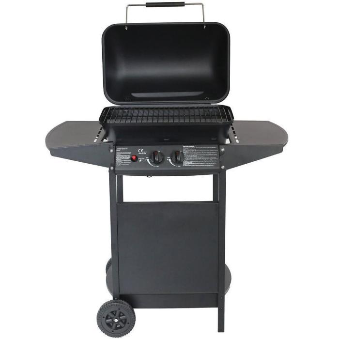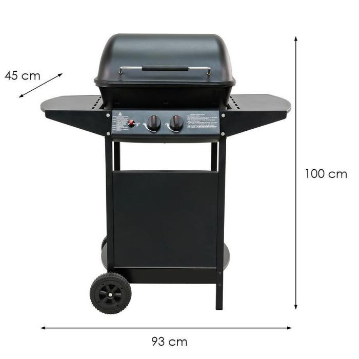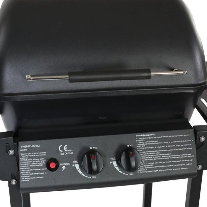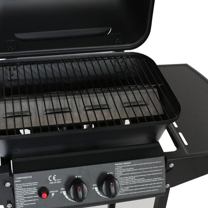 Materiał wykonania to blacha stalowa. Powierzchnia grillowania wynosi 50x32 cm. Grill posiada 2 palniki o mocy 5,4 kW z regulacją mocy dla lewej i prawej strony palenisk.