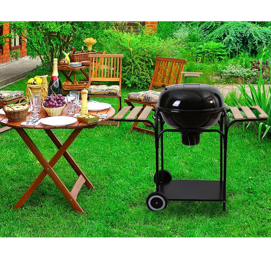 Grill kulisty z bocznymi półkami o średnicy 44 cm to niezastąpiony sprzęt dla miłośników grillowania. Wykonany z wysokiej jakości blachy stalowej, zapewnia solidność i trwałość przez wiele sezonów grillowania. Jego praktyczne wymiary - 98 cm szerokości, 46 cm głębokości i 105 cm wysokości - sprawiają, że jest odpowiedni dla różnych przestrzeni ogrodowych czy tarasowych.