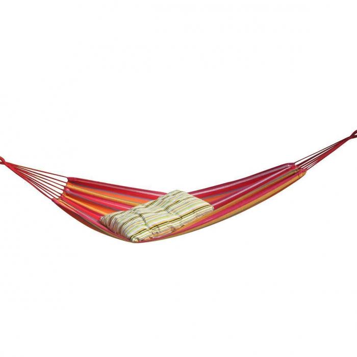 Hamak został wykonany z miłej w dotyku bawełny. Jest wytrzymały i nierozciągliwy dzięki domieszce poliestru. Posiada długie sznury, które pozwalają na zawieszenie zarówno na drzewie jak i na stelażu. Rozmiar hamaka gwarantuje komfort użytkowania i pełen relaks. Do hamaka dołączony jest pokrowiec z tego samego materiału, który zamykany jest ściągaczem. Hamak można prać w pralce. Kolory, które zostały zastosowane przy hamaku są letnie i żywe.