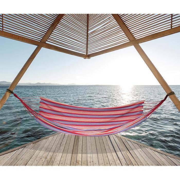 Hamak został wykonany z miłej w dotyku bawełny. Jest wytrzymały i nierozciągliwy dzięki domieszce poliestru. Posiada długie sznury, które pozwalają na zawieszenie zarówno na drzewie jak i na stelażu. Rozmiar hamaka gwarantuje komfort użytkowania i pełen relaks. Do hamaka dołączony jest pokrowiec z tego samego materiału, który zamykany jest ściągaczem. Hamak można prać w pralce. Kolory, które zostały zastosowane przy hamaku są letnie i żywe.