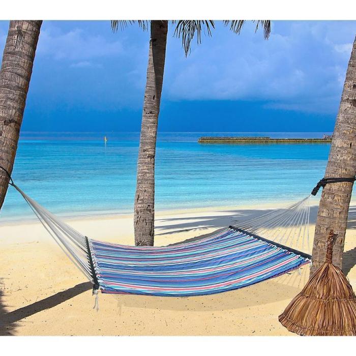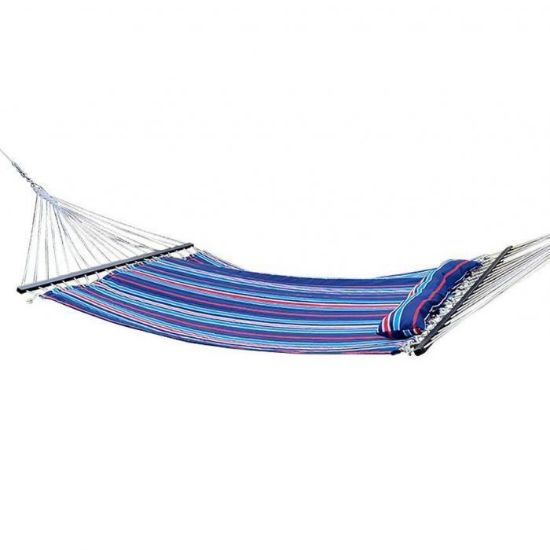 Dwuosobowy i usztywniany hamak z poduszką w zestawie to idealna propozycja na relaks z ulubioną książką oraz z drugą osobą. Został wykonany z miłej w dotyku bawełny. Jest wytrzymały i nierozciągliwy dzięki domieszce poliestru. Dodatkowo materiał jest wypełniony gąbką, co daje pełen komfort podczas użytkowania. Posiada długie sznury, które pozwalają na zawieszenie zarówno na drzewie jak i na stelażu. Rozmiar hamaka gwarantuje komfort użytkowania i pełen relaks.