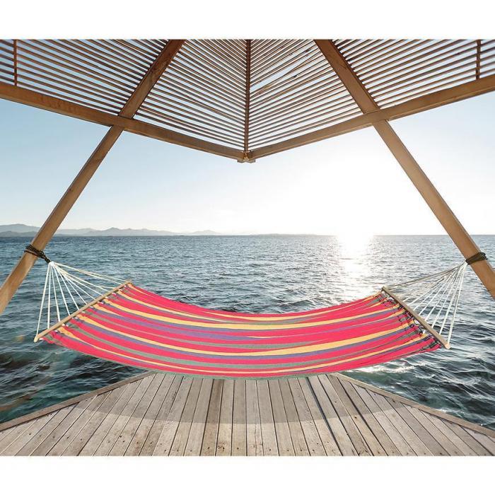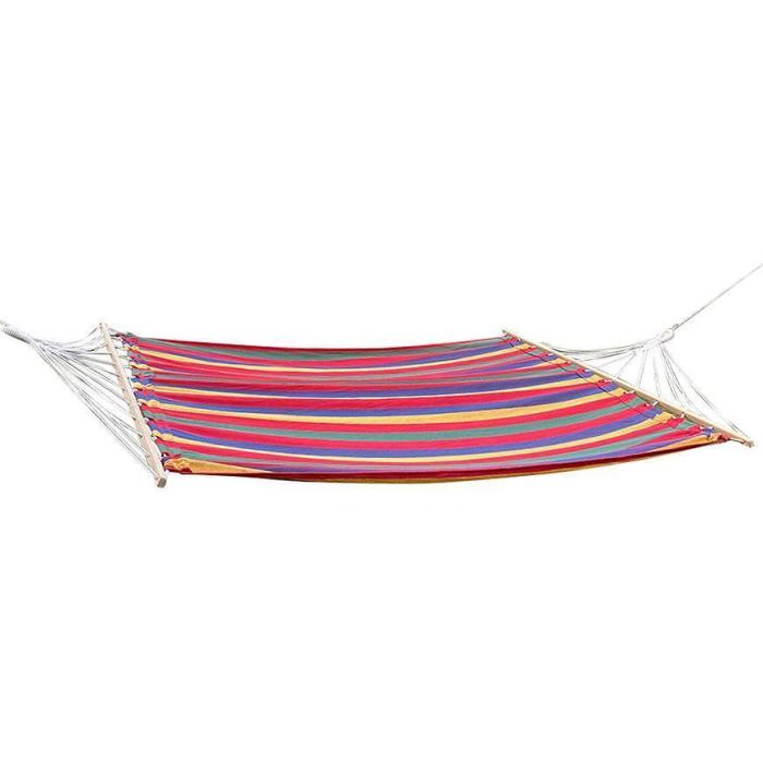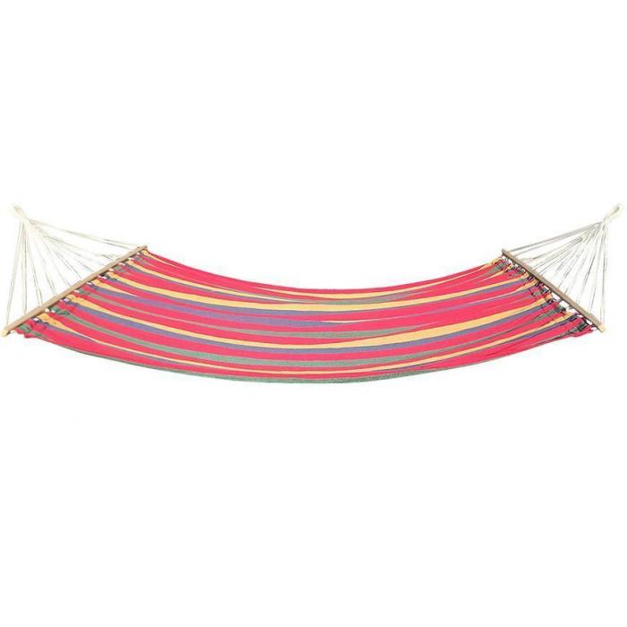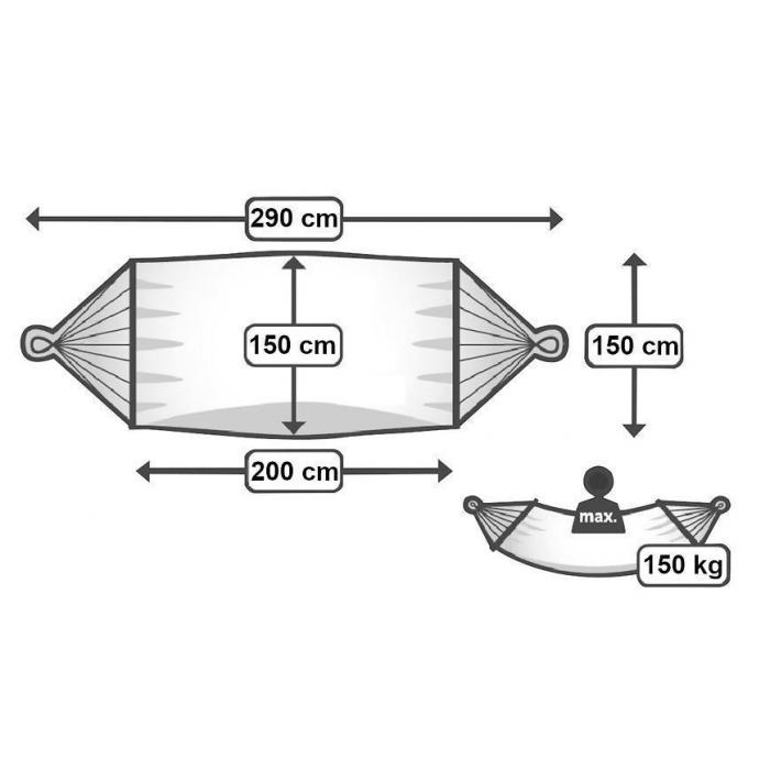 Hamak został wykonany z miłej w dotyku bawełny. Jest wytrzymały i nierozciągliwy dzięki domieszce poliestru. Posiada długie sznury, które pozwalają na zawieszenie zarówno na drzewie jak i na stelażu. Rozmiar hamaka gwarantuje komfort użytkowania i pełen relaks. Kolory, które zostały zastosowane przy hamaku są letnie i żywe.
