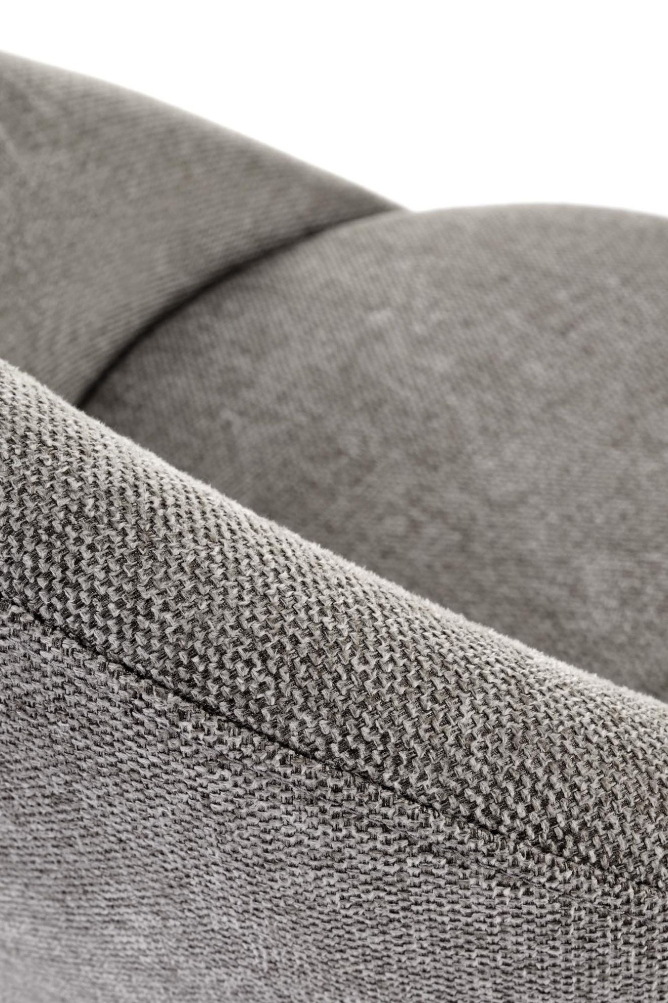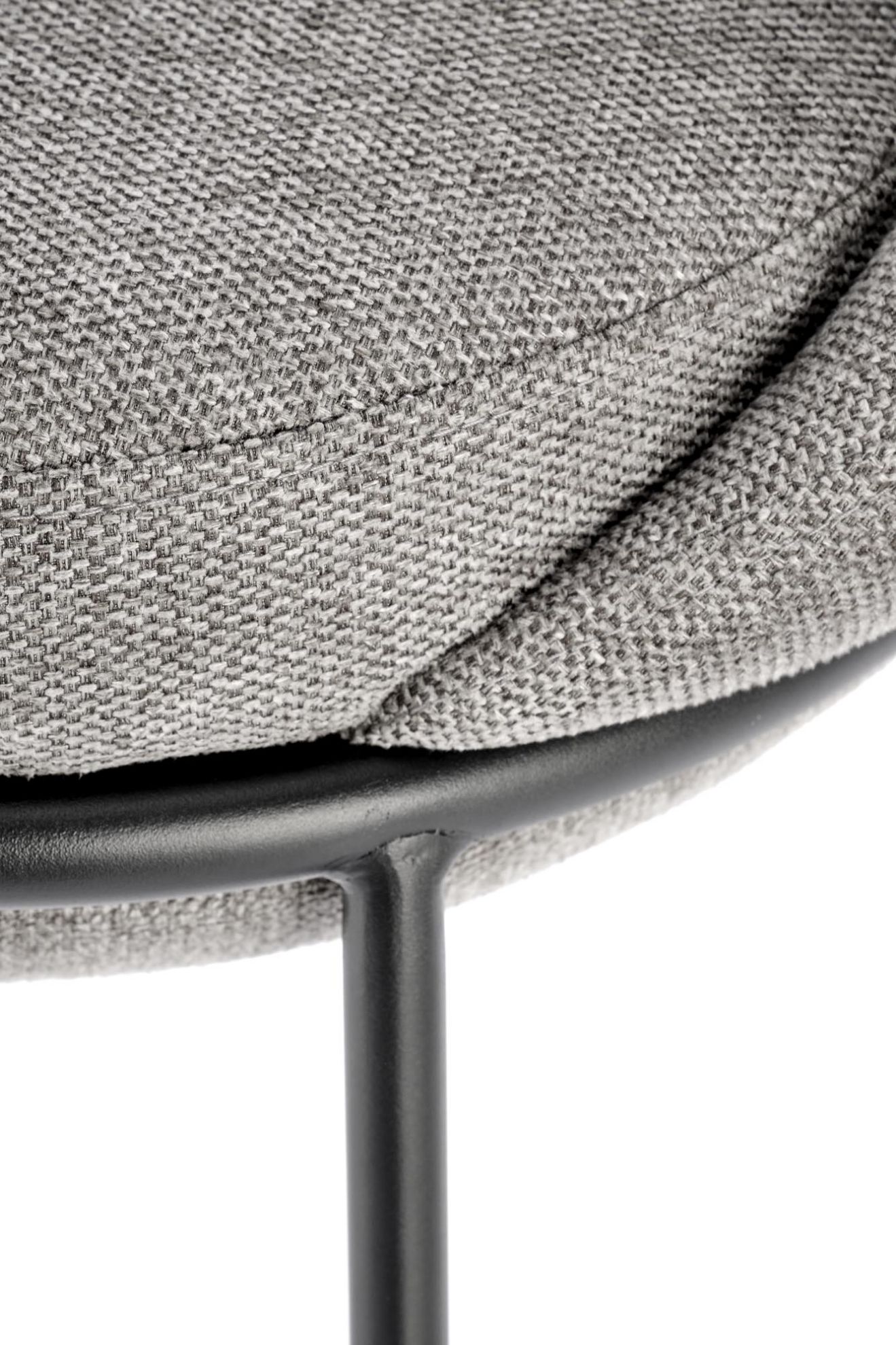 Siedzisko tapicerowane tkaniną zapewnia komfort podczas siedzenia i jest estetyczne w kuchennej przestrzeni. Metalowy stelaż malowany proszkowo gwarantuje trwałość i stabilność, co jest istotne przy codziennym użytkowaniu w kuchni. Brak podłokietników ułatwia wsuwanie hokera pod blat i zwiększa funkcjonalność w kompaktowej przestrzeni.
