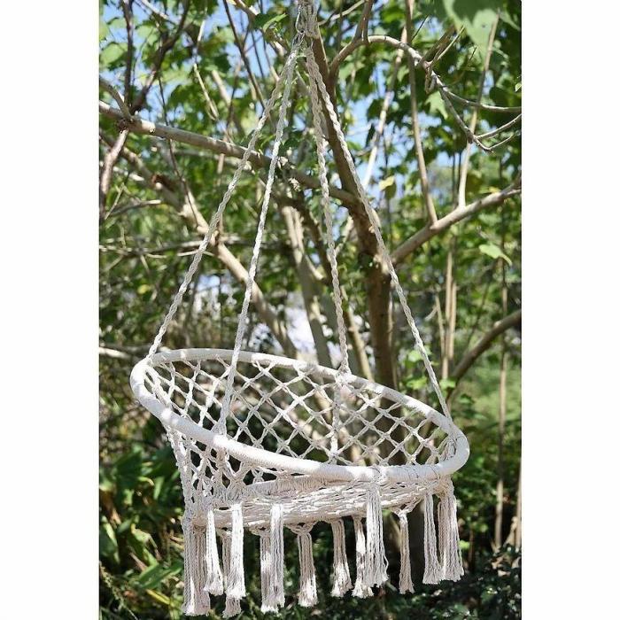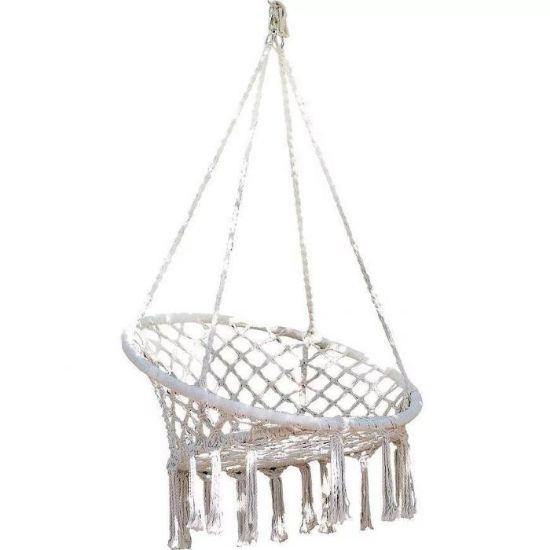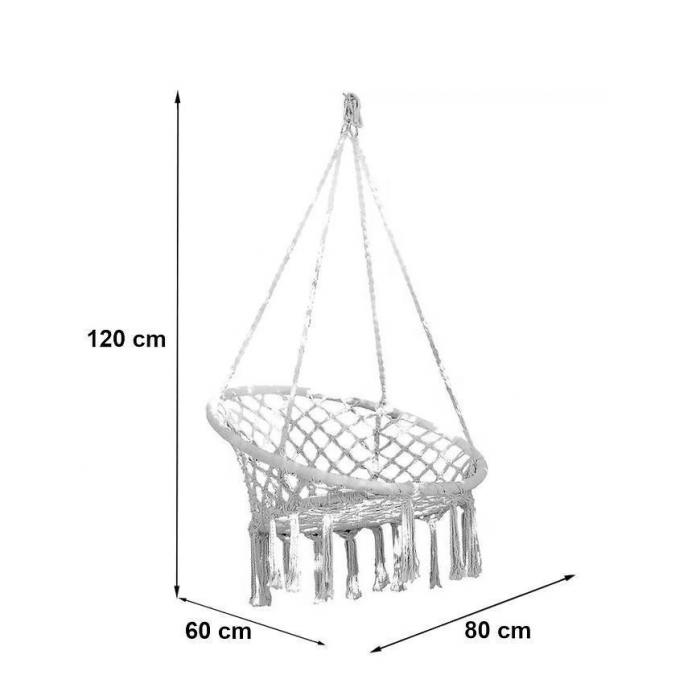 Biała huśtawka bocianie gniazdo - okrągła zawieszona na czterech sznurach huśtawka dla dzieci i dorosłych. Huśtawka bocianie gniazdo posiada metalowy stelaż, nie ma więc obaw, że starci swój kształt podczas użytkowania, jest dostosowania do obciążenia nawet do 120 kg. Wygodne, mocno naciągnięte sznurki nie uwierają i są wygodne w użytkowaniu. Dodatkowo huśtawka została ozdobiona stylowymi frędzlami, które ładnie komponują się z całością. Huśtawkę można umieścić zarówno wewnątrz jak i na zewnątrz. Z huśtawki bocianie gniazdo mogą korzystać już trzylatki pod opieką osoby dorosłej.