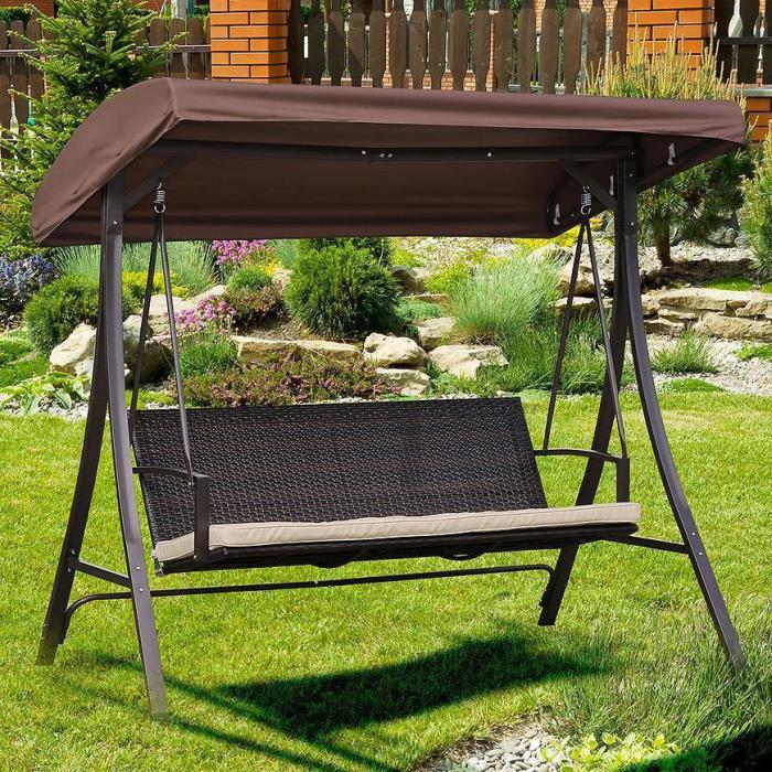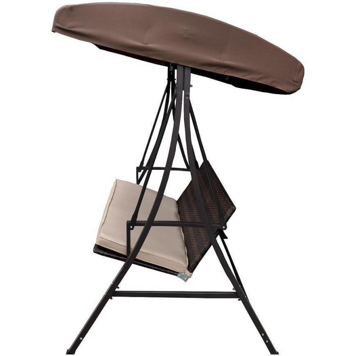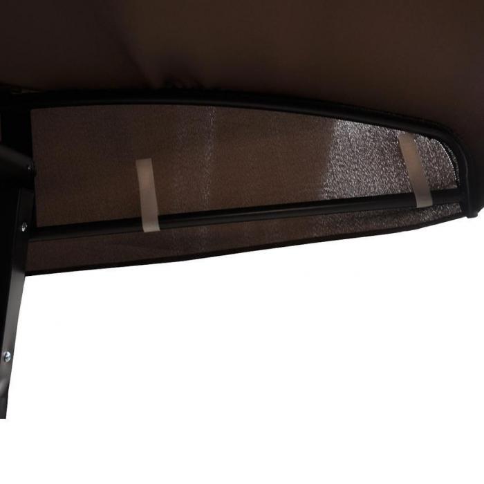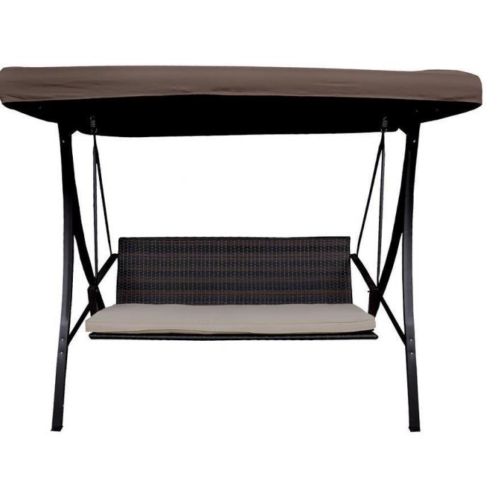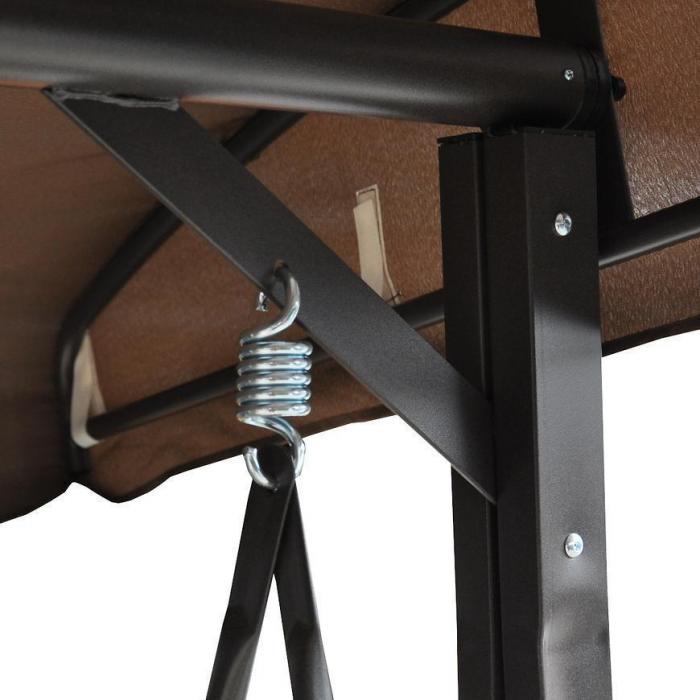 Wyposażona w szerokie siedzisko i oparcie oraz duży dach z wydłużonym końcem, huśtawka zapewnia wygodę i ochronę przed słońcem oraz deszczem. Dodatkowo, grubo wypełniona poduszka w ciepłym beżowym kolorze zwiększa komfort użytkowania. Dach można łatwo zdemontować bez konieczności demontażu całej konstrukcji, co ułatwia jego czyszczenie oraz przechowywanie w przypadku deszczu.