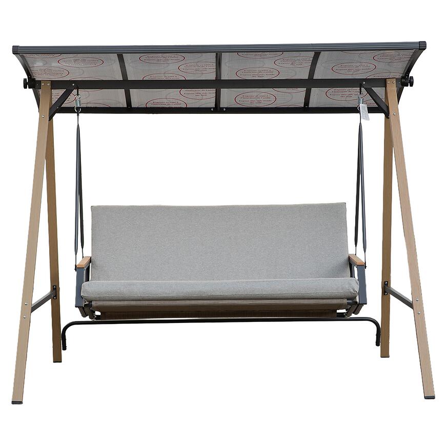 Solidny stelaż wykonany z aluminium zapewnia trwałość konstrukcji oraz odporność na warunki atmosferyczne. Elementy konstrukcyjne zostały pomalowane proszkowo, co zwiększa ich wytrzymałość i estetykę. Nogi huśtawki posiadają kolor przypominający drewno, natomiast pozostałe elementy utrzymane są w ciemnoszarej kolorystyce.