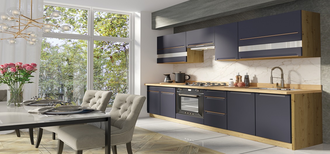 Kolekcja Glamour dostępna jest w trzech kolorach: zielonym, niebieskim i białym, uzupełnione o elementy w kolorze dąb artisan. To połączenie koloru z ciepłym odcieniem drewna dąb artisan tworzy harmonijną i przyjemną estetykę kuchni.