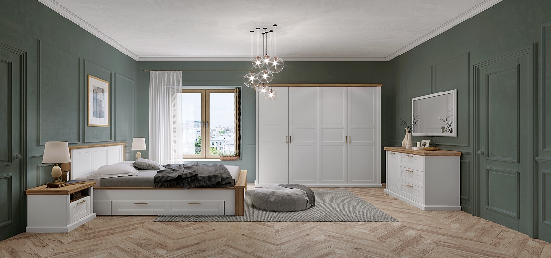 - Łóżko z zagłówkiem, które jest centralnym punktem każdej sypialni. Do łóżka można dokupić szafki nocne, które są idealne na lampkę nocną i inne niezbędne akcesoria.