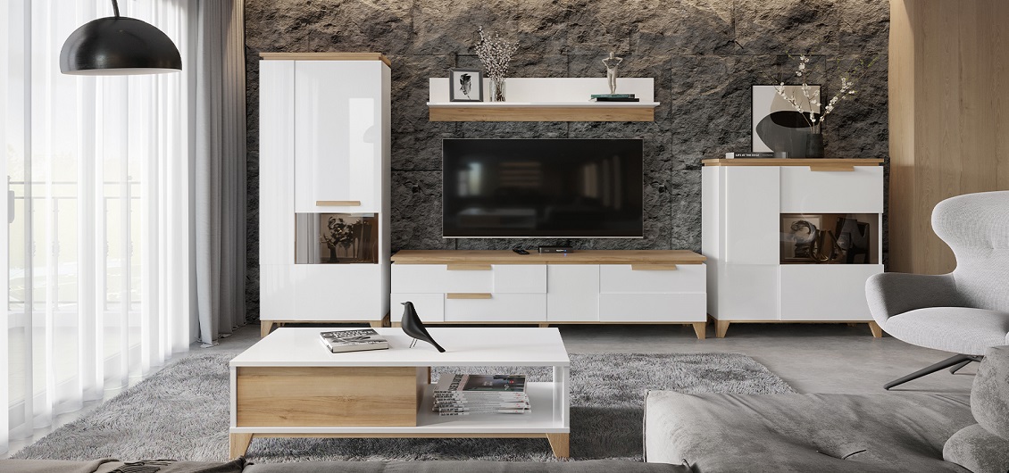 Witryny dwudrzwiowe - zarówno wysoka, jak i niska - oferują zarówno miejsce do przechowywania, jak i możliwość eksponowania dekoracji czy kolekcji. Półka ścienna wisząca to funkcjonalne miejsce na wyeksponowanie cennych przedmiotów, tworząc spersonalizowaną przestrzeń.