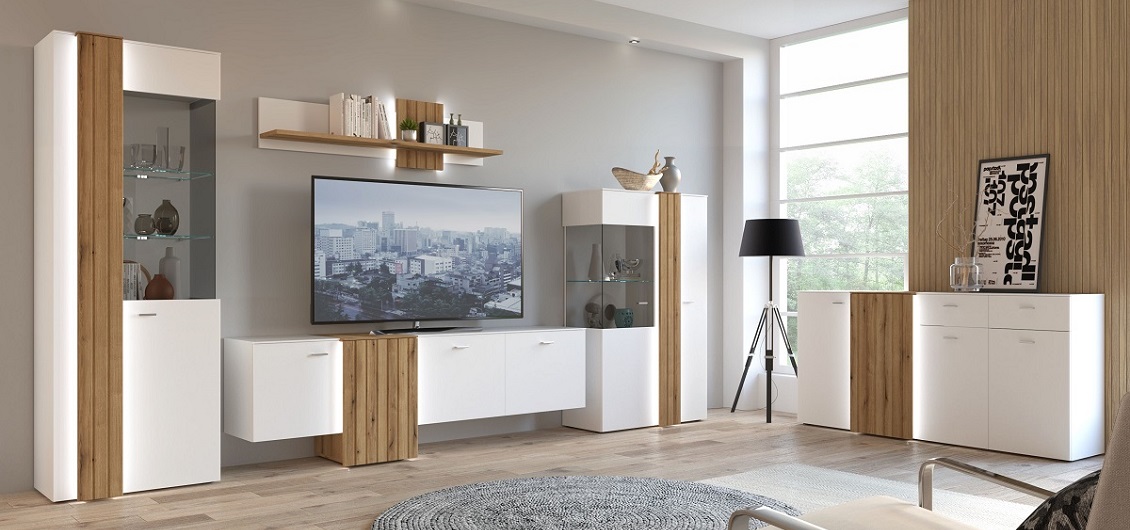 Komoda czterodrzwiowa z dwoma szufladami oferuje dużo miejsca do przechowywania, a jednocześnie jest eleganckim elementem wystroju. Wysoka jednodrzwiowa witryna oraz niska dwudrzwiowa witryna są idealnymi rozwiązaniami do wyeksponowania Twoich ulubionych przedmiotów, a szkło hartowane w drzwiach witryn dodaje im elegancji. Szklane półki w witrynach pozwalają na atrakcyjne prezentowanie kolekcji książek lub ozdobnych przedmiotów. Szafki RTV pod telewizor są praktycznymi i stylowymi rozwiązaniami do organizacji przestrzeni wokół telewizora.