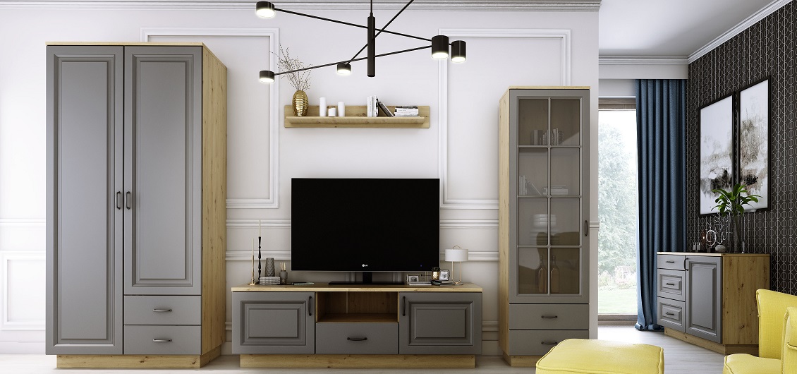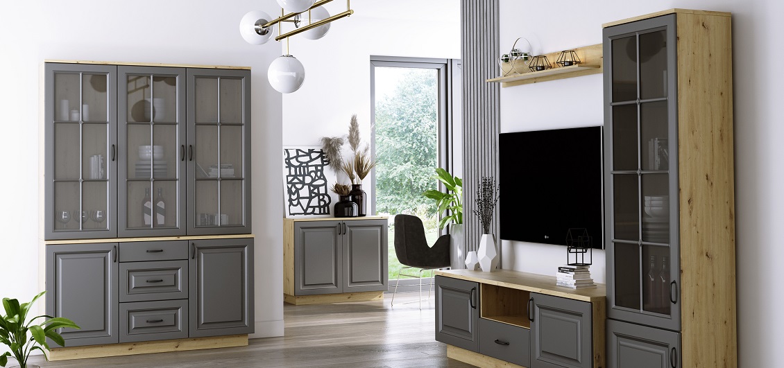 Przedstawiamy kolekcję mebli do pokoju dziennego Flawia, która łączy w sobie nowoczesny styl z elementami klasyki. Wszystkie meble wykonane są z trwałej płyty wiórowej laminowanej, co zapewnia nie tylko solidność, ale także estetyczny wygląd. Kolekcja Flawia dostępna jest w dwóch eleganckich dekorach: grafitowym i dąb artisan, co pozwala dopasować meble do różnych aranżacji wnętrz.