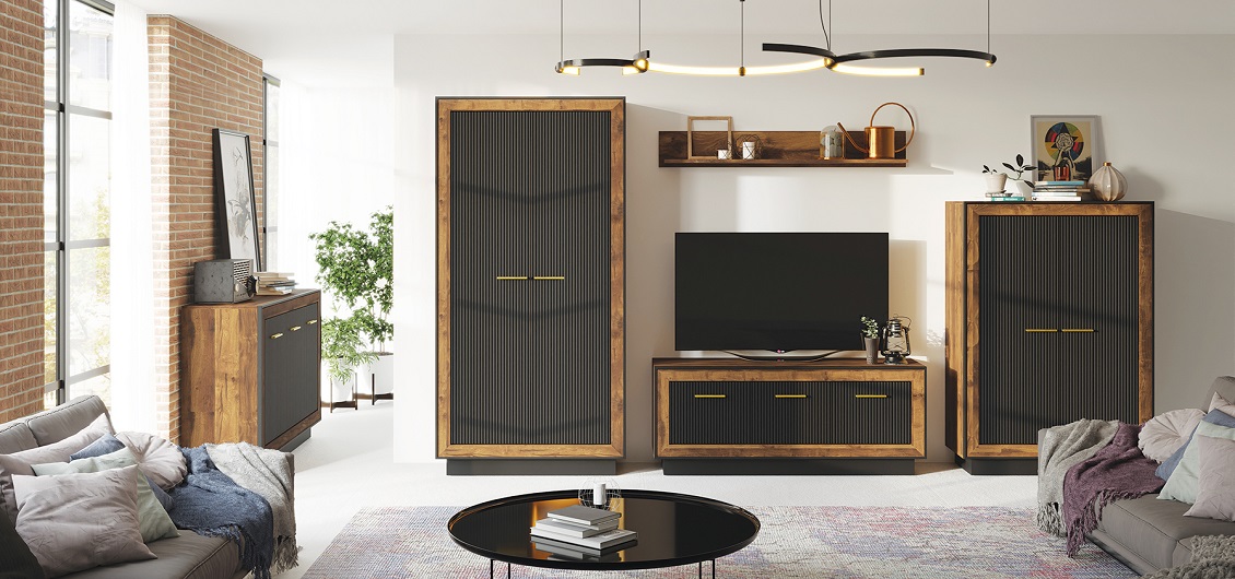 Dekor eger w połączeniu z czernią tworzy wyrafinowaną kombinację, która dodaje meblom Fox elegancji i prestiżu. Ciepłe odcienie drewna harmonijnie współgrają z głębią koloru czerni, tworząc zjawiskowy kontrast. Dodatkowe elementy w kolorze złotym nadają kolekcji luksusowy akcent, który idealnie komponuje się z nowoczesnym charakterem mebli.