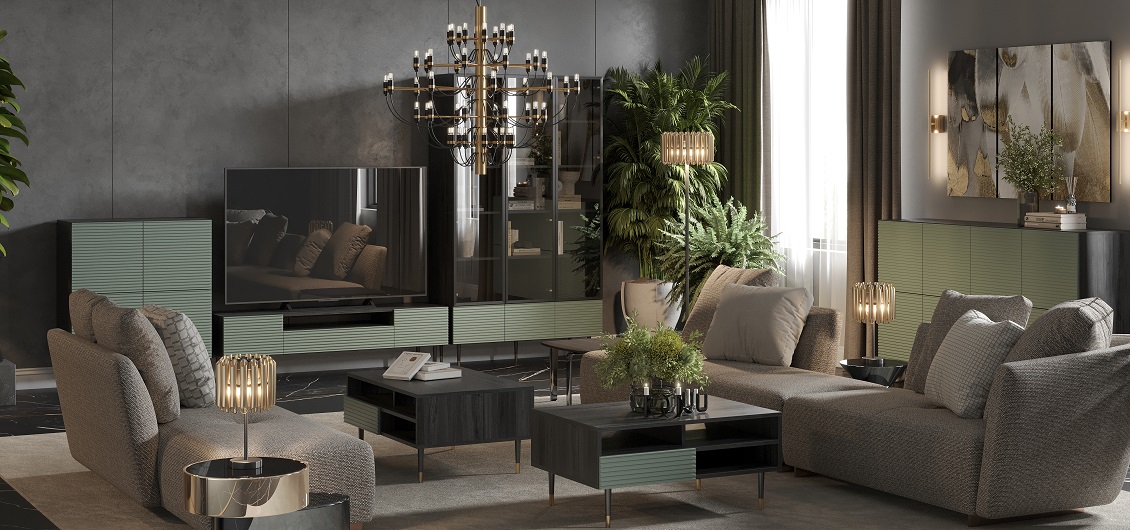 System Imperial pistacjowa zieleń można zestawić z dodatkami w kolorze złota, czerni, beżu lub jasnego drewna, tworząc stylową i przytulną przestrzeń wypoczynkową.