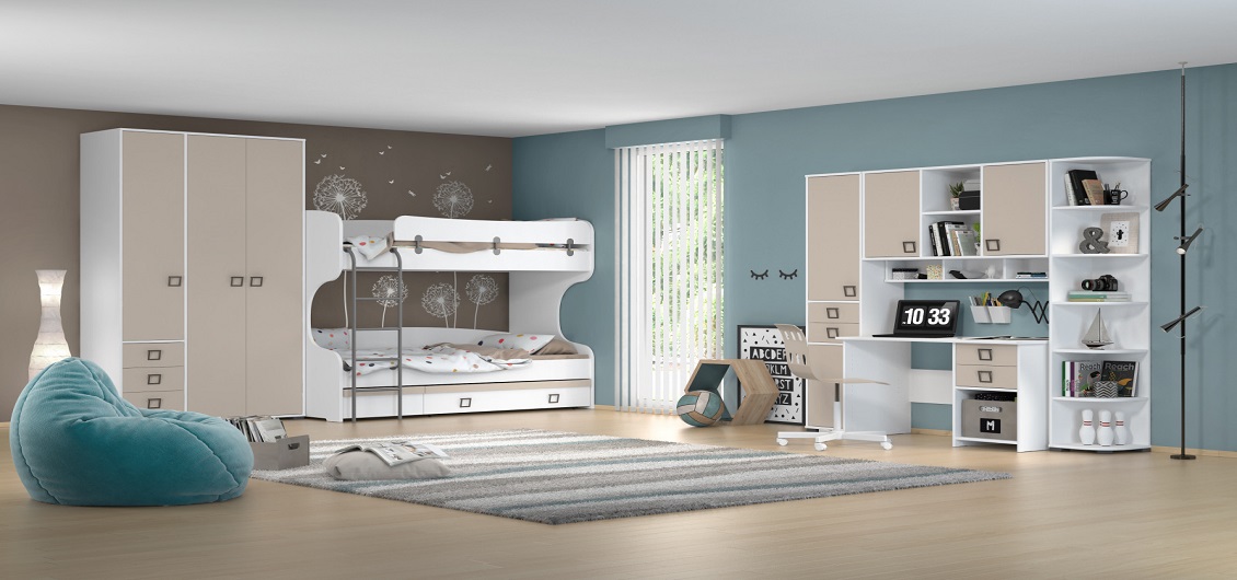 Kolekcja mebli do pokoju młodzieżowego Kiki przyciąga spojrzenia i zachwyca funkcjonalnością. Wykonane z wysokiej jakości płyty wiórowej laminowanej, meble w białym dekorze z akcentami w kolorze sand, emanują elegancją i blaskiem. Ich matowe wykończenie dodaje wyjątkowego charakteru, tworząc przyjemną w dotyku powierzchnię.