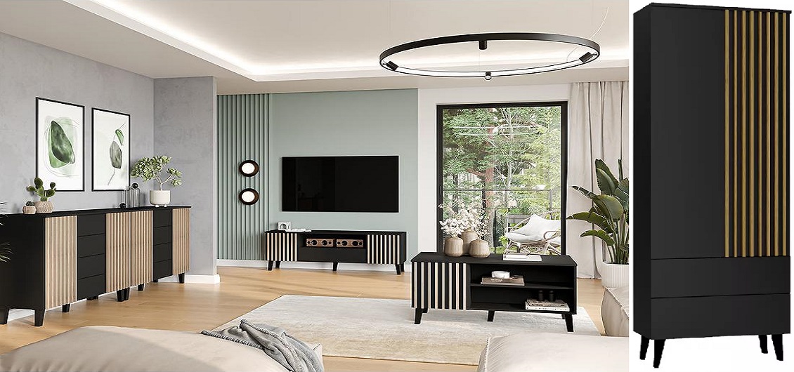 Meble z kolekcji Lamillo wykonane są z trwałej płyty wiórowej laminowanej, co gwarantuje ich długotrwałą jakość i odporność na uszkodzenia. Kolekcja jest dostępna w eleganckim czarnym dekorze z subtelnie podkreślającymi elementami w kolorze dąb artisan. To połączenie kontrastujących kolorów dodaje meblom unikalnego charakteru.