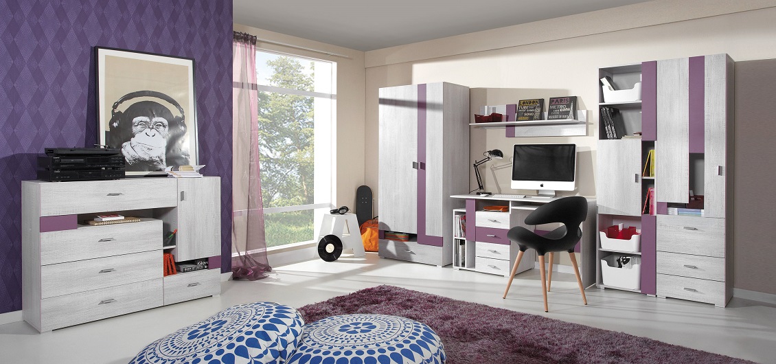 Kolekcja mebli do pokoju młodzieżowego Next przynosi nową erę stylu i funkcjonalności. Wykonane z trwałej płyty wiórowej laminowanej, meble o dekorze sosny z delikatnymi akcentami w kolorze viola stanowią wyraz artystycznego wzornictwa. Ich matowe wykończenie nadaje im subtelnego uroku, a zarazem sprawia, że są przyjemne w dotyku.