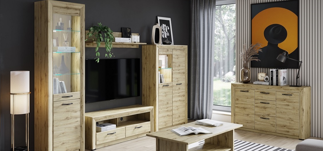 Szafka pod telewizor, regał wiszący z zamykanymi drzwiami, półka wisząca, ława oraz stół rozkładany kompleksowo uzupełniają ofertę systemu Sapori. To zróżnicowane elementy, które pozwalają na stworzenie spójnej i funkcjonalnej przestrzeni w Twoim domu.