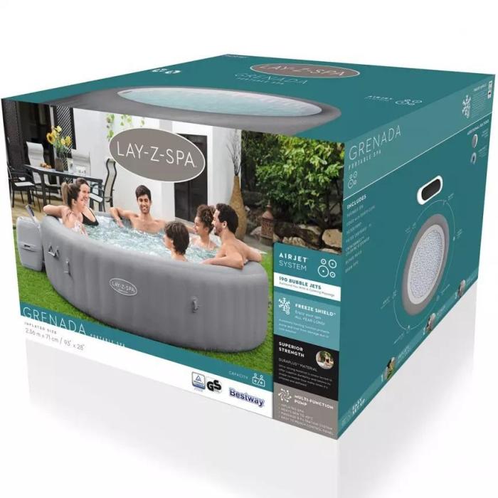 - Zawartość: 1 spa, 1 pokrywa basenu, 1 pompa spa, 1 dozownik ChemConnect™, wkład filtra (VI), łatka naprawcza, system AirJet™