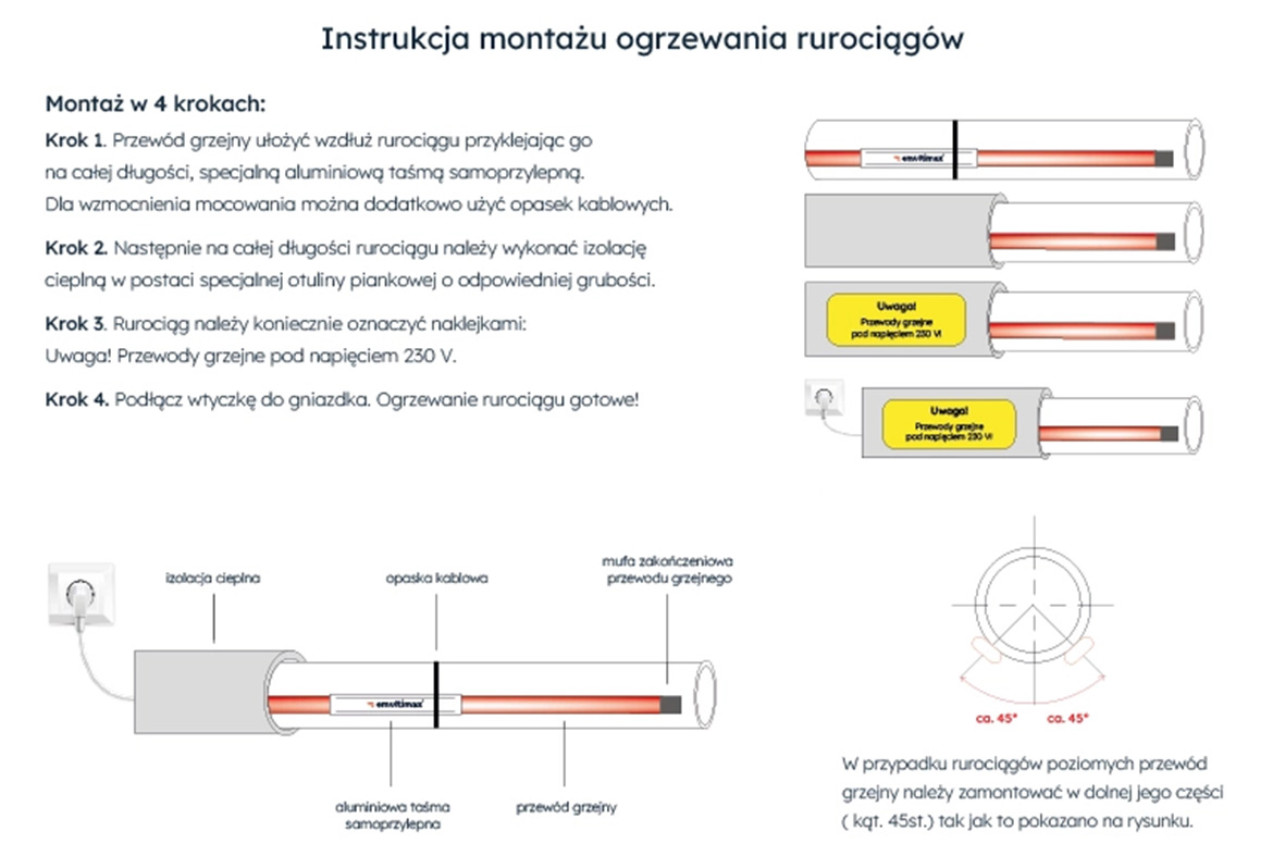 Dzięki prostej instalacji, montaż przewodu jest łatwy i intuicyjny. Kabel można łatwo przymocować do powierzchni, które wymagają ochrony przed mrozem, a 3-metrowy przewód zasilający zakończony wtyczką umożliwia bezproblemowe podłączenie do zasilania. Dodatkowo, system ten nie wymaga konserwacji ani przeglądów, co czyni go bezobsługowym i wygodnym w codziennym użytkowaniu.