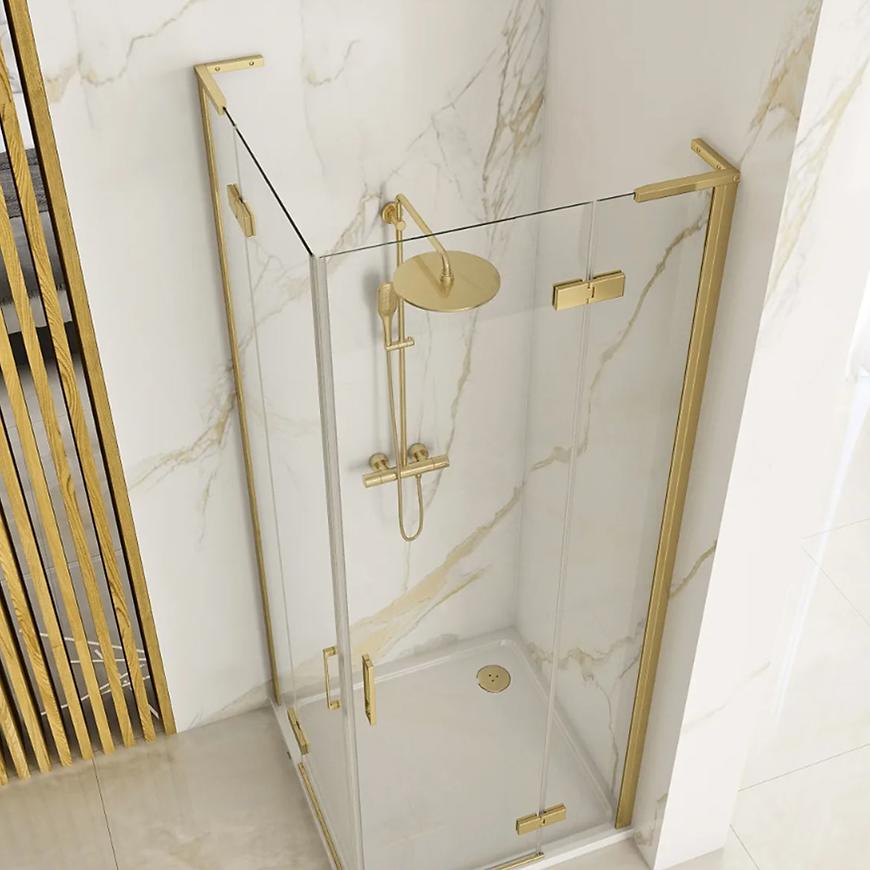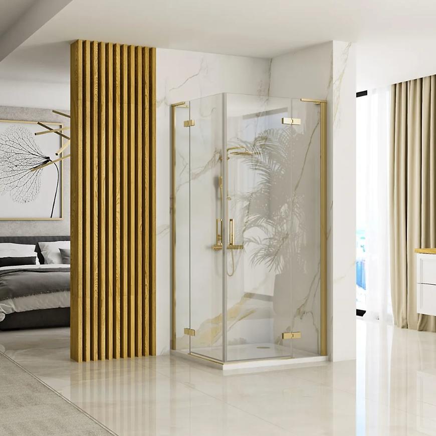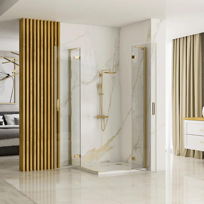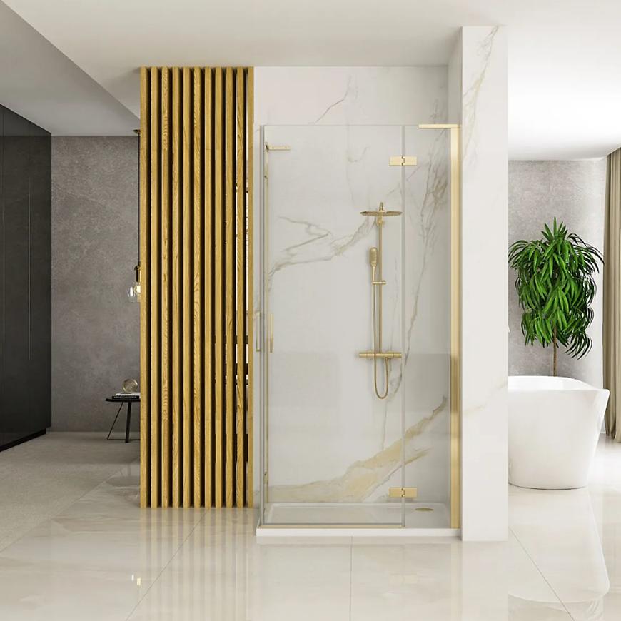 Profil kabiny w kolorze złotym (gold brush) nadaje elegancki i nowoczesny charakter. Szkło bezbarwne optycznie powiększa przestrzeń i podkreśla lekkość wnętrza.