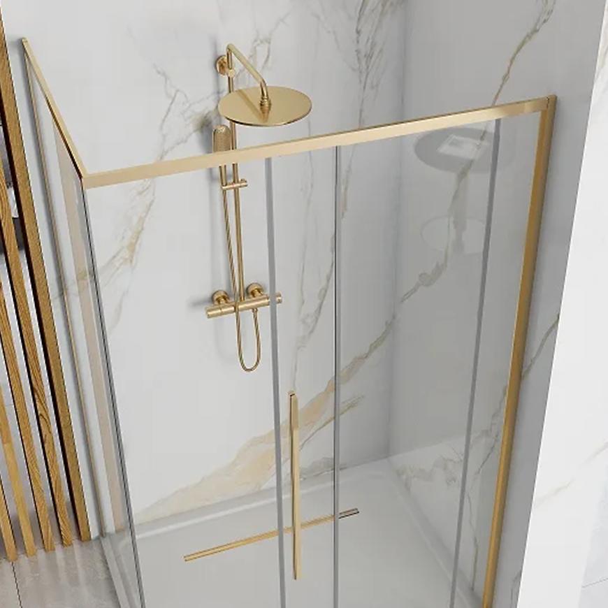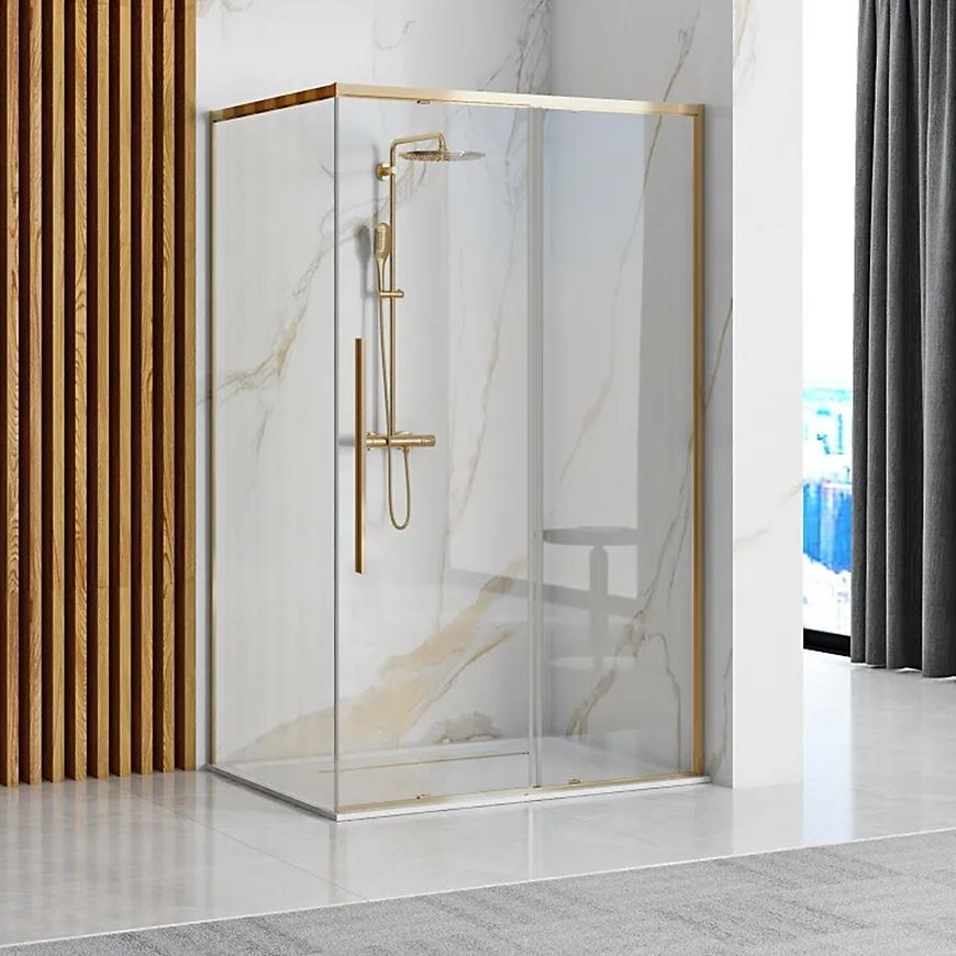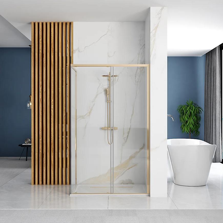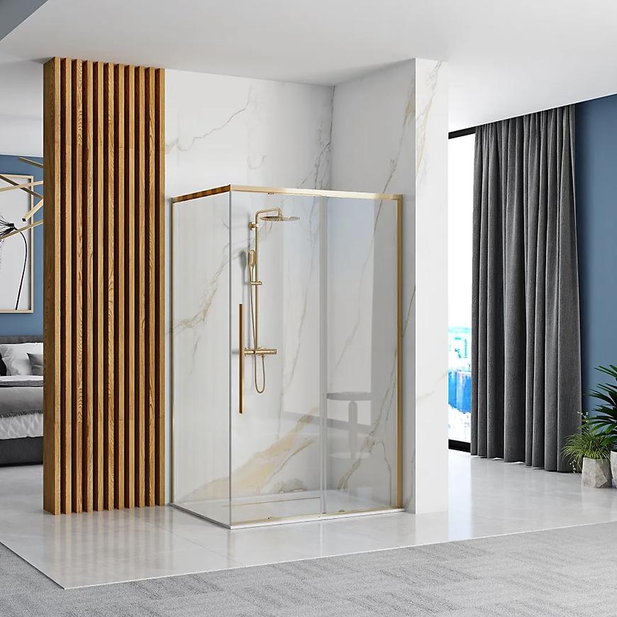 Kształt kabiny jest prostokątny, co dodaje jej charakteru, idealnego do nowoczesnych wnętrz. Grubość szkła wynosi 6 mm, a kolor profilu jest elegancko wykonany w zlotym odcieniu, co nadaje stylowy wygląd. Kabina posiada bezbarwne szkło hartowane, które jest trwałe i odporne na uszkodzenia, co zapewnia bezpieczne korzystanie przez długi czas. Magnetyczne uszczelki dbają o szczelność kabiny, zapobiegając wyciekom wody.