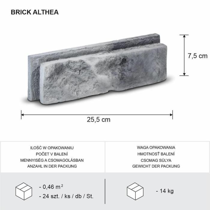 Kamień Betonowy Brick Althea Gray w kolorze szarym to dekoracyjna płytka ścienna imitująca cegłę, do montażu bezfugowego. Mrozoodporna, trwała, do wnętrz i na zewnątrz, idealna do nowoczesnych i eleganckich aranżacji ścian.