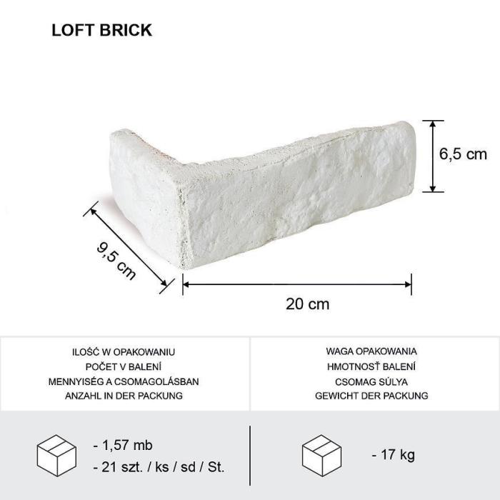 Kamień Betonowy Loft Brick Biały Narożnik to narożna płytka betonowa imitująca cegłę, do montażu do fugowania, mrozoodporna, do wnętrz i na zewnątrz, idealna do efektownych narożników ściennych.