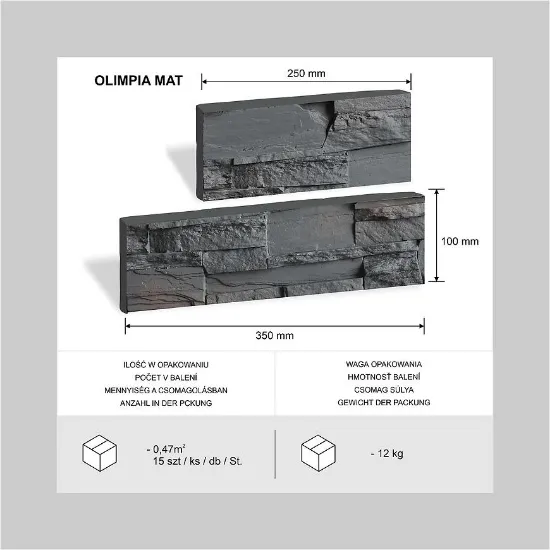 ​Kamień Betonowy Olimpia Mat to dekoracyjna płytka betonowa, która doskonale imituje naturalny kamień, nadając wnętrzom i elewacjom nowoczesny, elegancki charakter. Grafitowy kolor sprawia, że produkt harmonijnie komponuje się z różnymi stylami aranżacji.