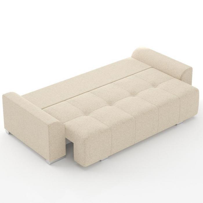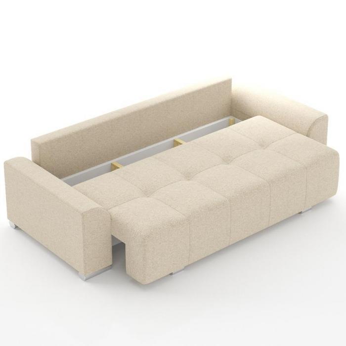 Rozkładana kanapa Aston posiada zalety funkcji spania. Funkcja spania o wymiarach 148x195cm zapewni dodatkową przestrzeń w salonie bądź w innym pomieszczeniu w domu. Wypełnienie wersalki to sprężyny faliste oraz pianka, co zapewni pełen komfort relaksu i wypoczynku. Dodatkowe miejsce zapewnia pojemnik na pościel, który pozwala na schowanie koca, poduszek lub innych produktów.