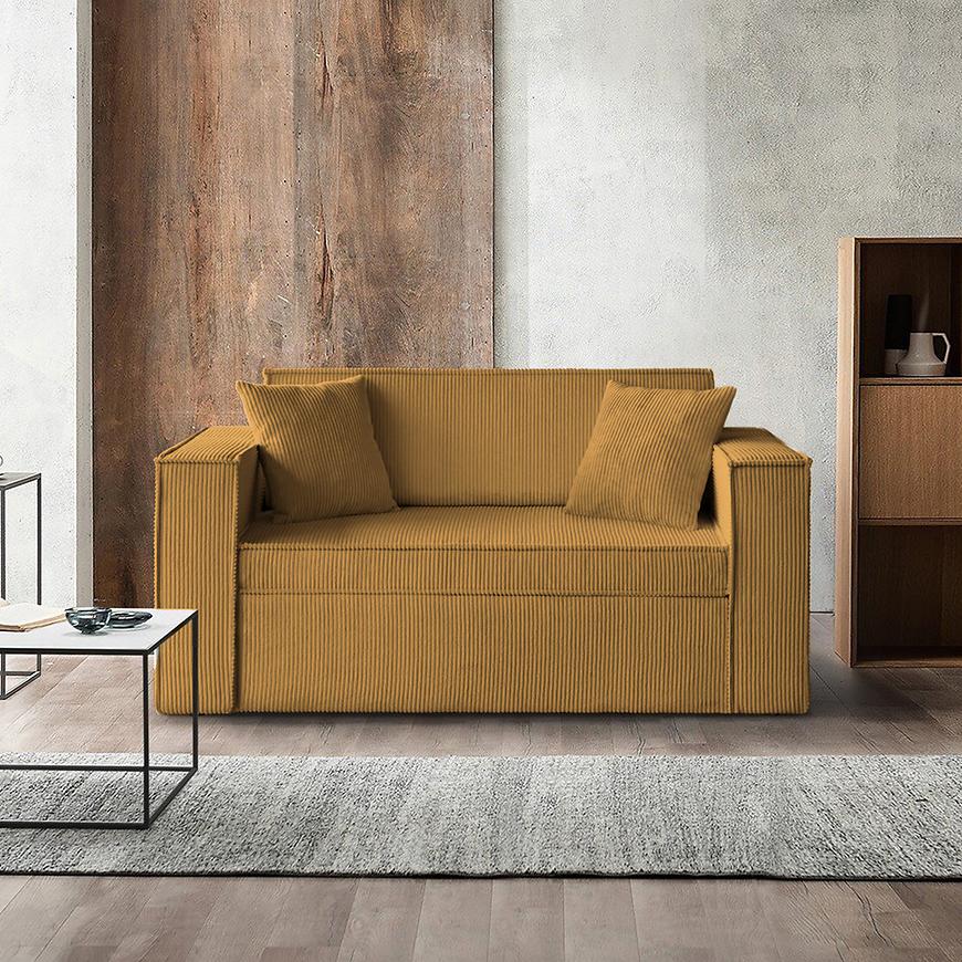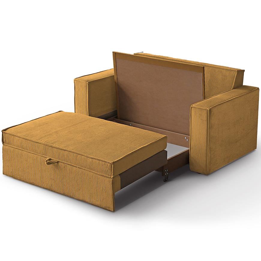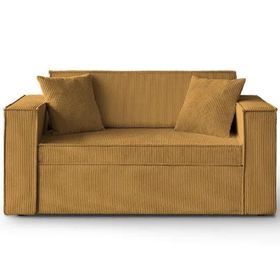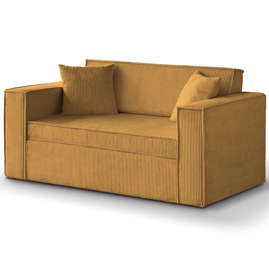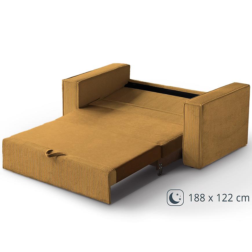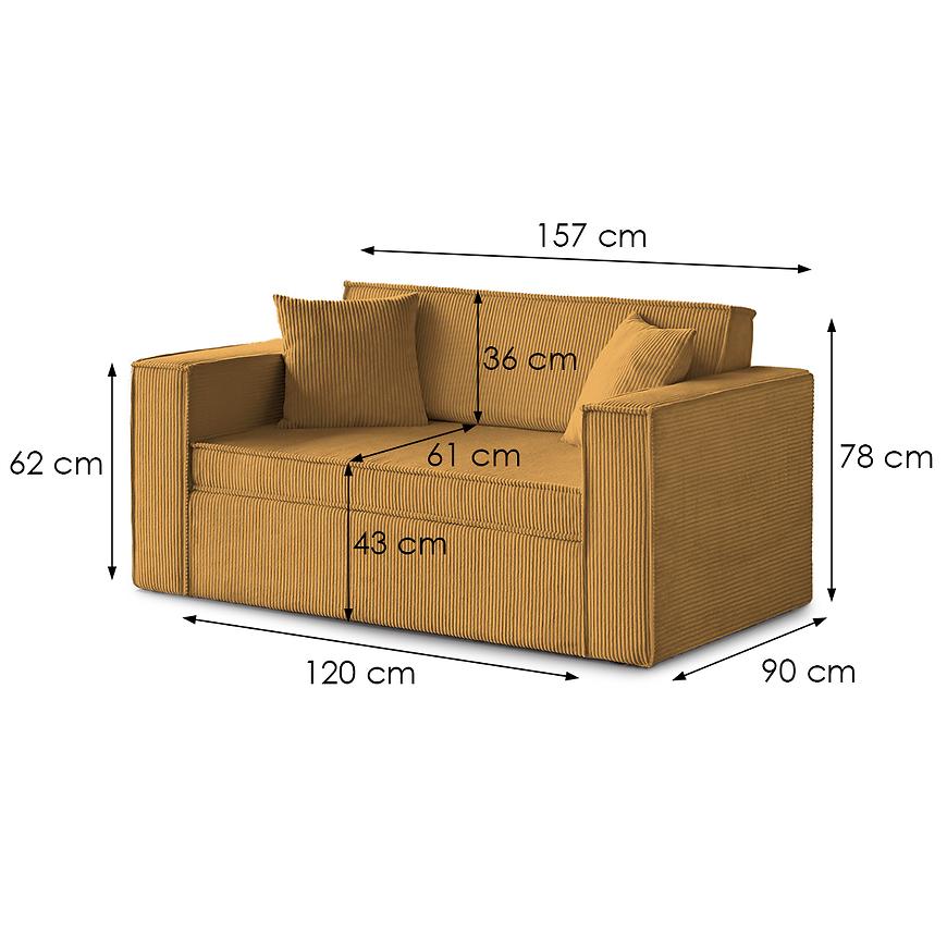 Kanapa Dave 120 Poso 01 to nowoczesna, musztardowa kanapa łącząca funkcję wygodnego siedziska z możliwością spania. Posiada automatyczny mechanizm wózkowy, który pozwala łatwo przekształcić ją w powierzchnię do spania o wymiarach 188x122 cm. Siedzisko wykonane jest z pianki, co zapewnia komfort użytkowania, a pod nim znajduje się praktyczny schowek na pościel. Kanapa ma wymiary 157 cm szerokości, 90 cm głębokości i 78 cm wysokości, przy wysokości siedziska 43 cm i głębokości siedziska 61 cm. Wyposażona jest w poduszkę dekoracyjną i ozdobną lamówkę, nie wymaga montażu i jest utrzymana w nowoczesnym stylu.
