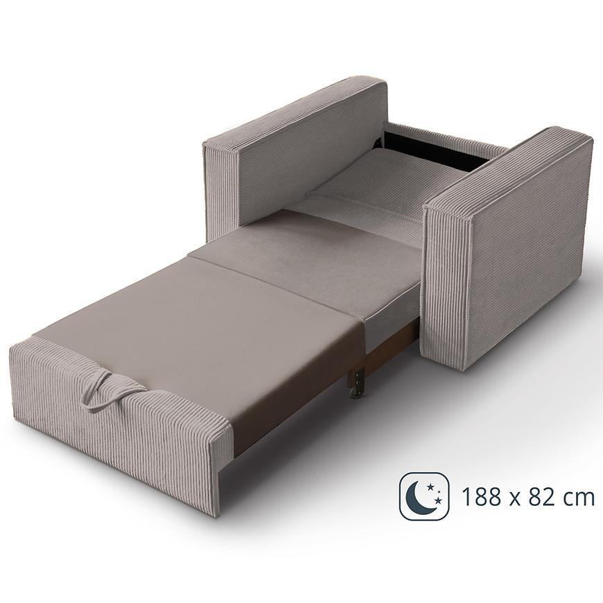 Model wyposażony jest w funkcję spania z mechanizmem rozkładania typu wózek, wspieranym przez automat do rozkładania, co zapewnia łatwość użytkowania. Po rozłożeniu kanapa oferuje wygodną powierzchnię spania o wymiarach 188x82 cm, a praktyczny schowek na pościel ułatwia przechowywanie.