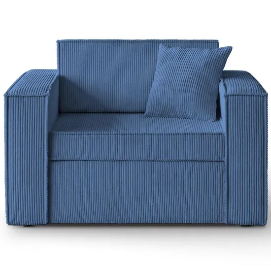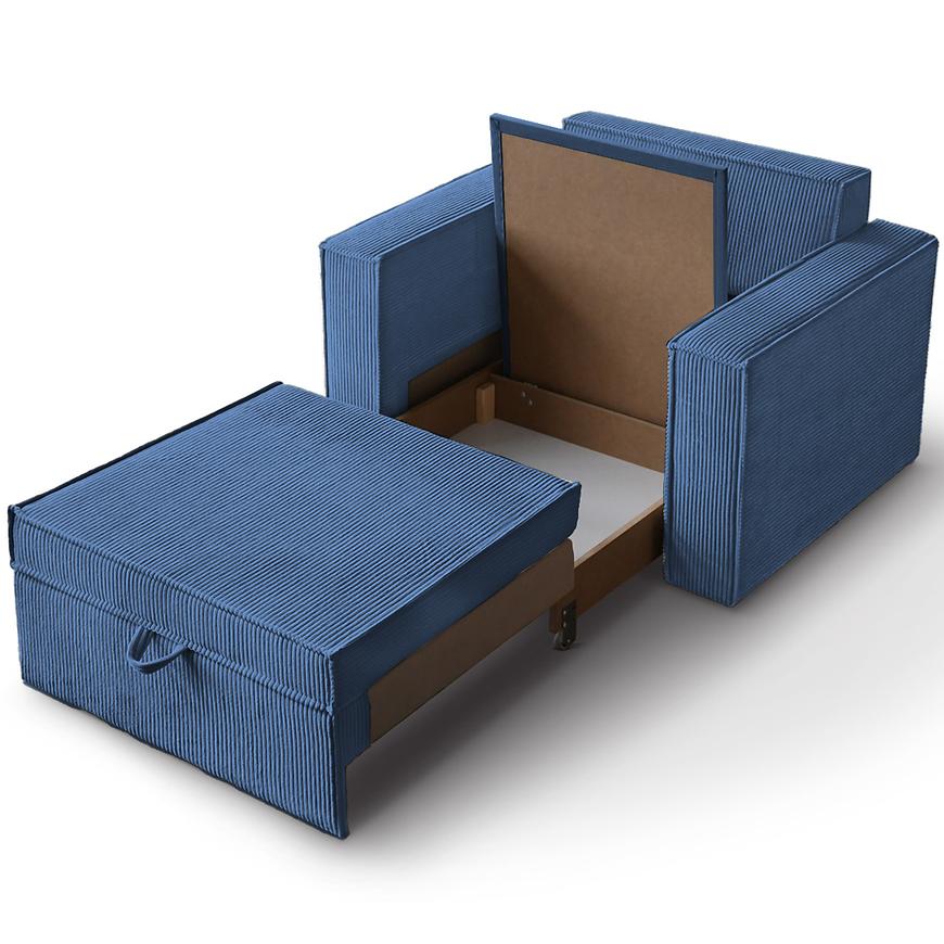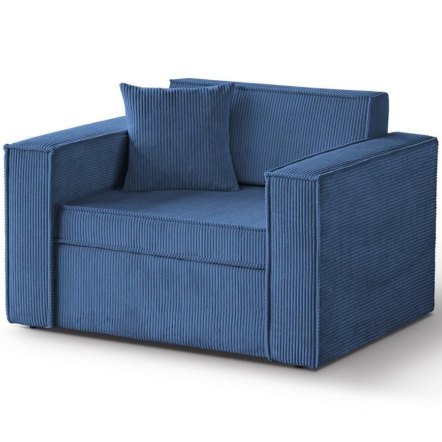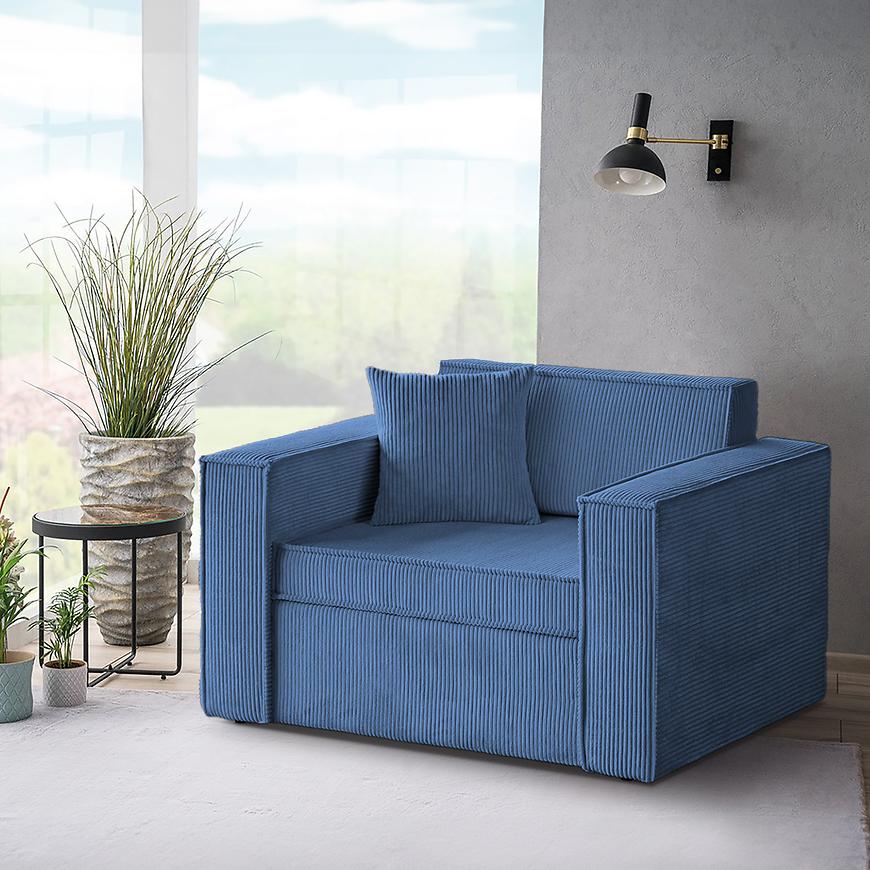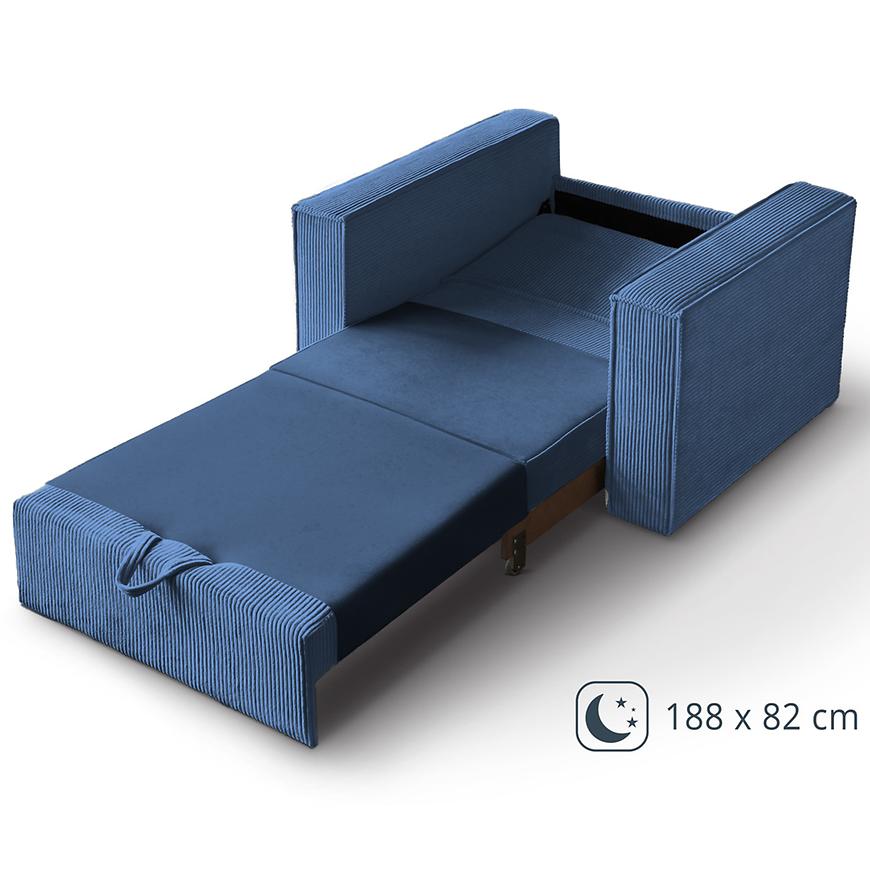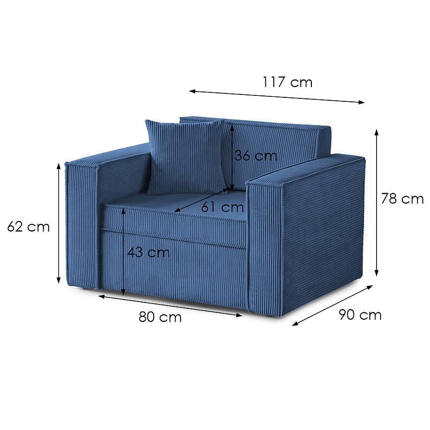 Kanapa Dave 80 Poso 05 to nowoczesny niebieski mebel, który łączy funkcję wygodnego siedziska z możliwością spania dzięki mechanizmowi wózkowemu i automatycznemu rozkładaniu. Pod siedziskiem znajduje się praktyczny schowek na pościel. Siedzisko i wypełnienie wykonane są z pianki, co zapewnia komfort użytkowania. Kanapa posiada ozdobną lamówkę i poduszkę dekoracyjną, nie wymaga montażu i wyróżnia się prostym, nowoczesnym designem. Jej wymiary to 117 cm szerokości, 90 cm głębokości i 78 cm wysokości, przy wysokości siedziska 43 cm i głębokości siedziska 61 cm, a powierzchnia spania wynosi 188x82 cm.