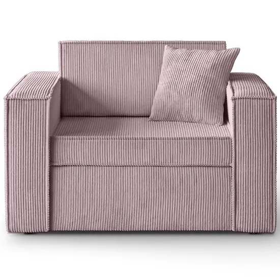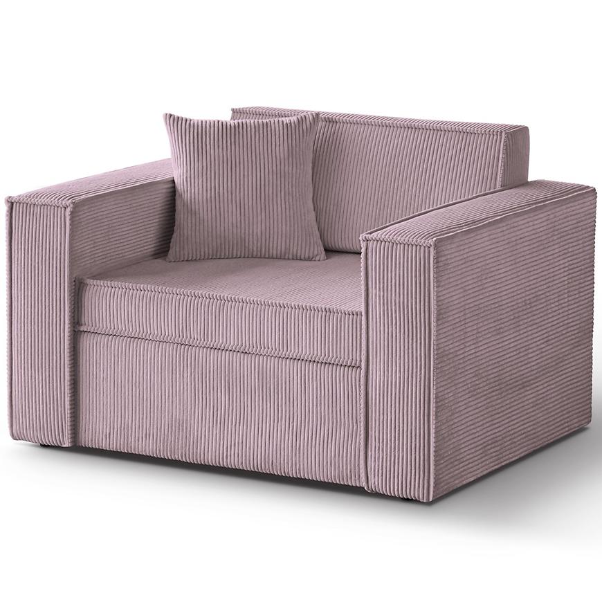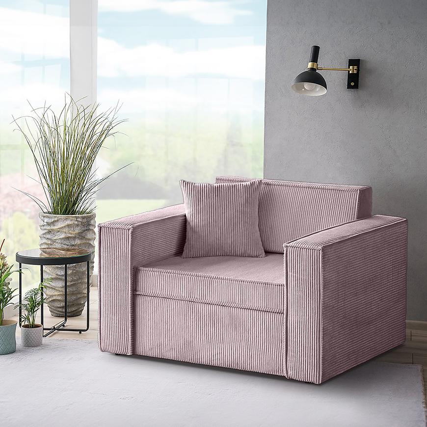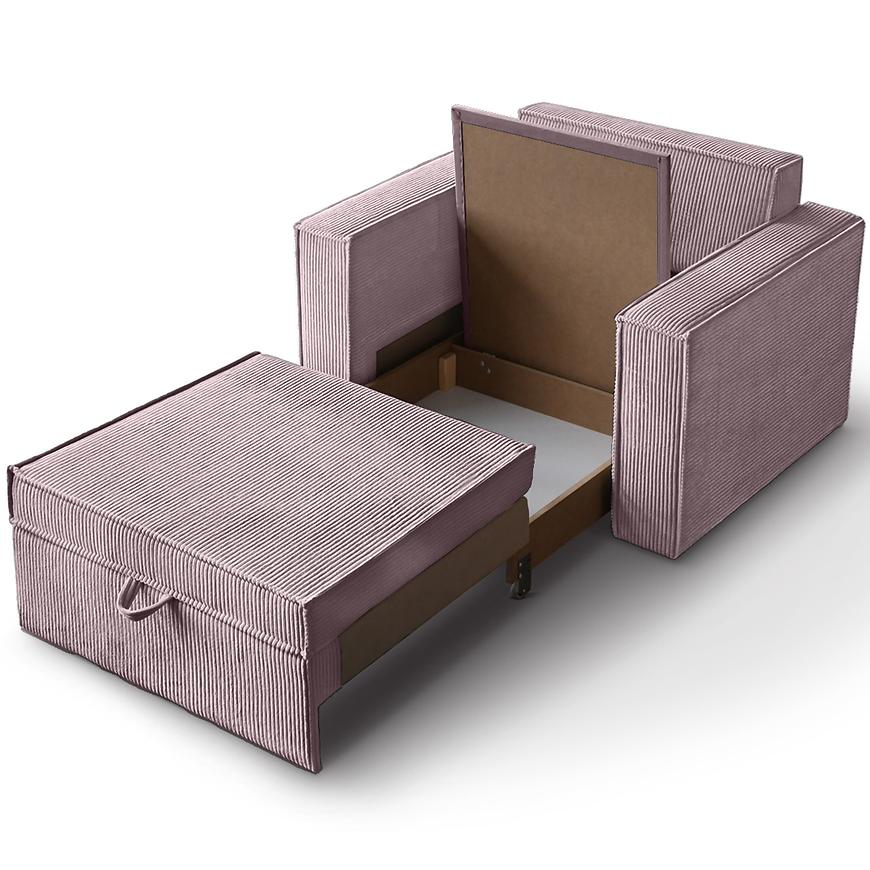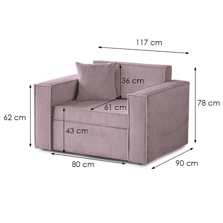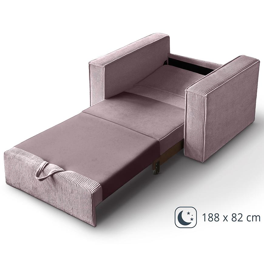 Kanapa Dave 80 Poso 27 to nowoczesna różowa kanapa, która łączy funkcję wygodnego siedziska z możliwością spania. Posiada automatyczny mechanizm wózkowy, który pozwala łatwo przekształcić ją w powierzchnię do spania o wymiarach 188x82 cm. Siedzisko i wypełnienie wykonane są z pianki, co zapewnia komfort użytkowania, a pod siedziskiem znajduje się praktyczny schowek na pościel. Kanapa wyposażona jest w poduszkę dekoracyjną oraz ozdobną lamówkę, nie wymaga montażu i ma wymiary 117 cm szerokości, 90 cm głębokości oraz 78 cm wysokości, przy wysokości siedziska 43 cm i głębokości siedziska 61 cm.