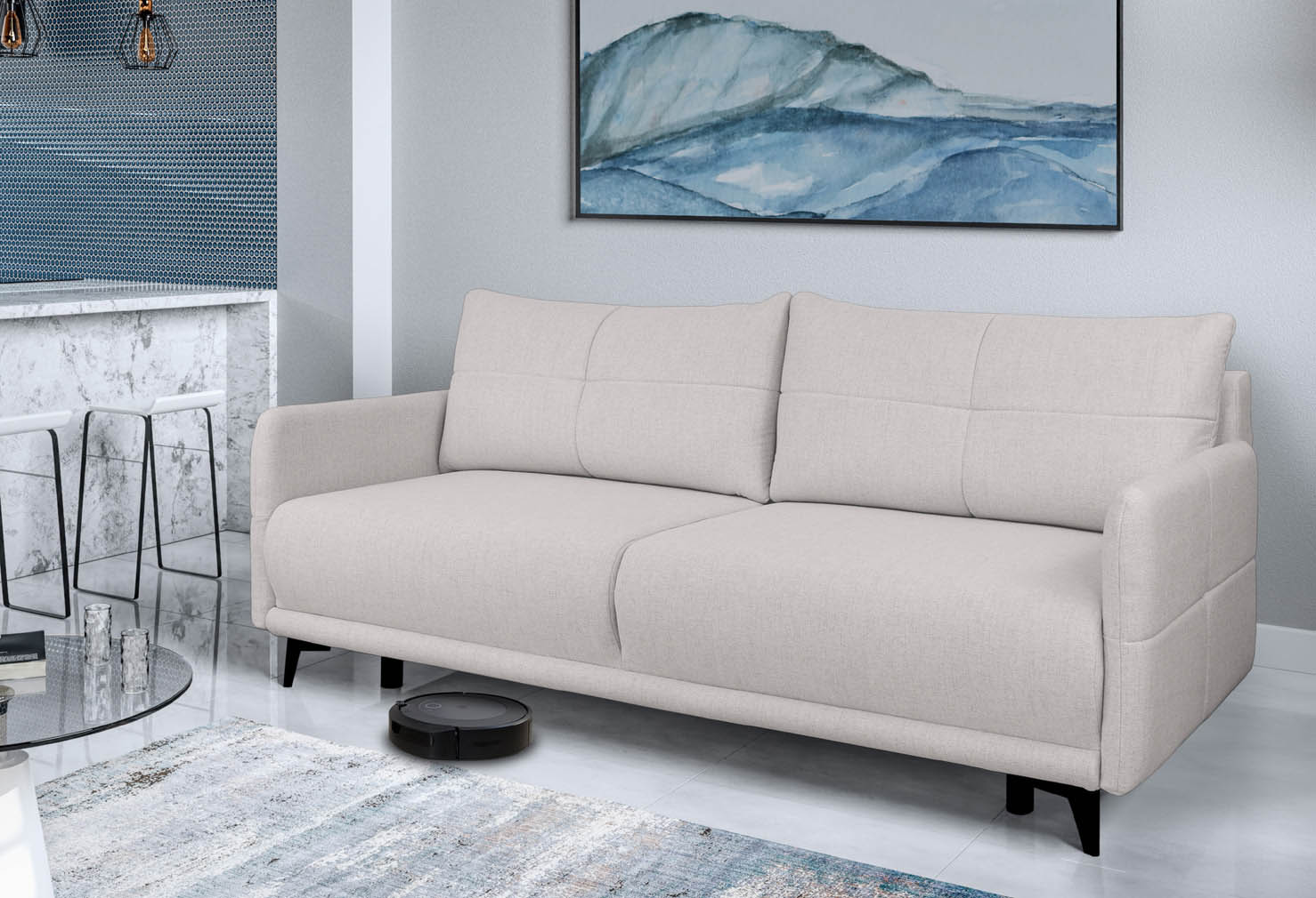 Nogi kanapy wykonane z wysokiej jakości plastiku zapewniają stabilność i łatwość utrzymania czystości. Kanapa Ellis charakteryzuje się również imponującą ładownością, umożliwiającą bezpieczne użytkowanie z obciążeniem do 120 kg na osobę.