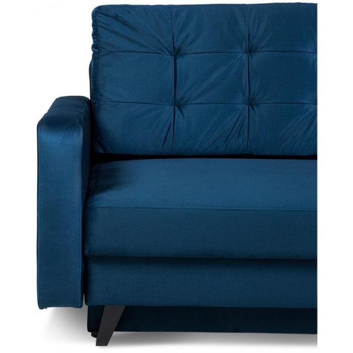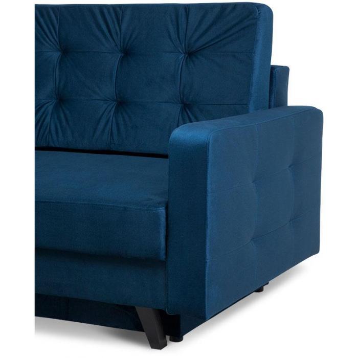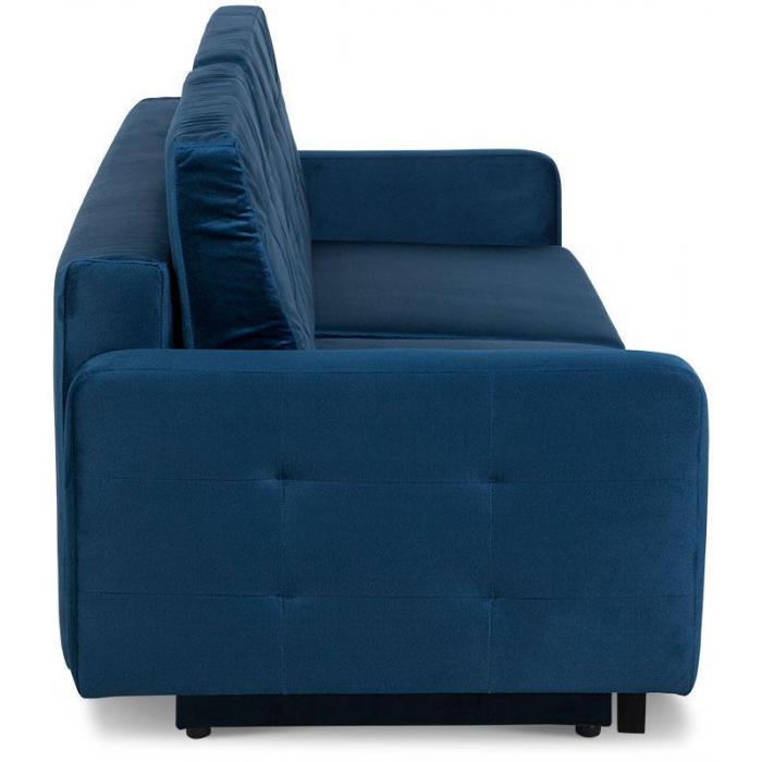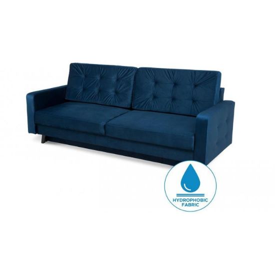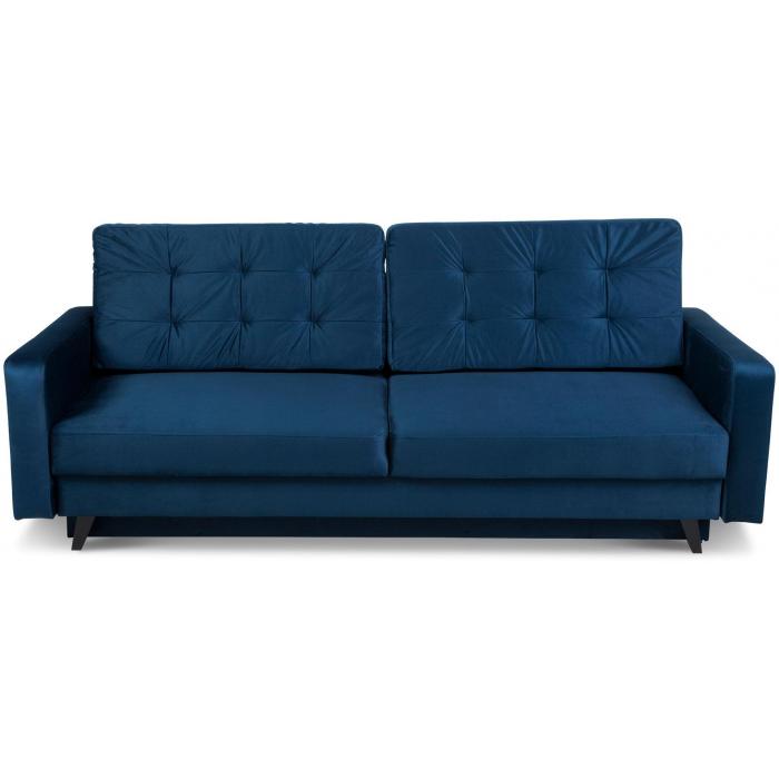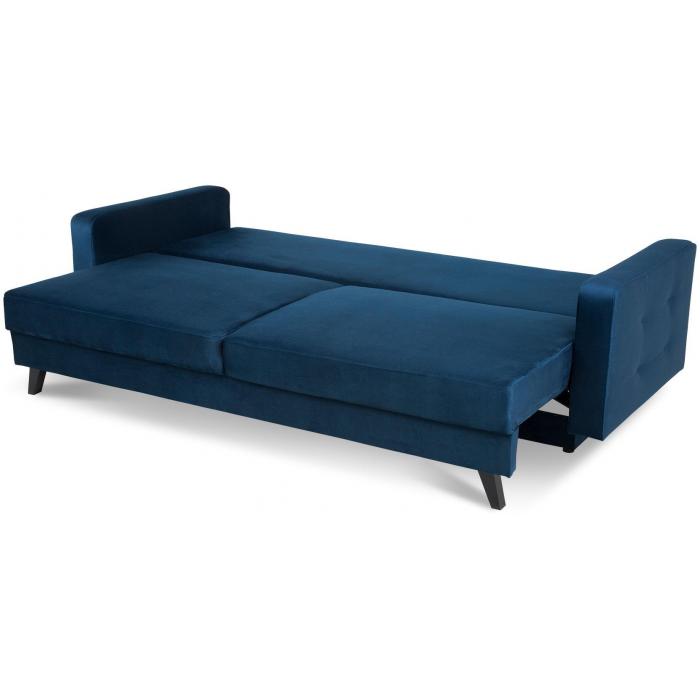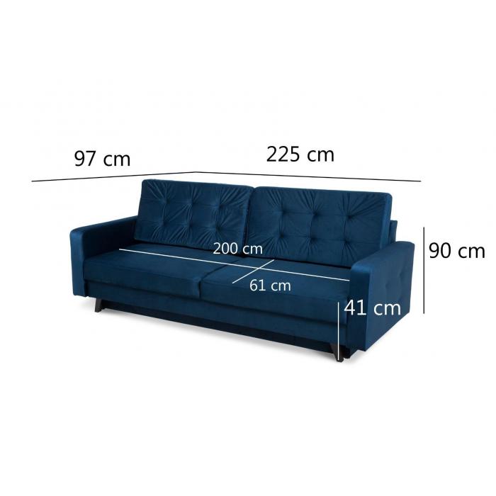 Trzyosobowa kanapa z boczkami, funkcją spania i pojemnikiem na pościel. W komplecie kanapy pikowane poduszki wykonane z pianki profilowanej. W siedzisku mebla zastosowano sprężyny faliste, a w oparciu sprężyny bonellowe. Sposób rozkładania DL z automatem. Po rozłożeniu sofy otrzymujemy powierzchnię spania o wymiarach 144x200 cm. Tylne nóżki wykonane z tworzywa w kolorze czarnym, przednie nóżki wykonane z drzewa w kolorze czarnym.