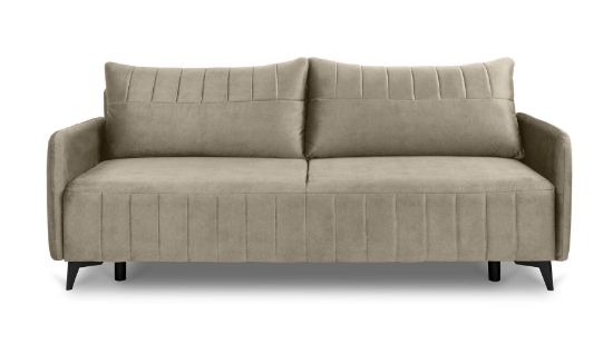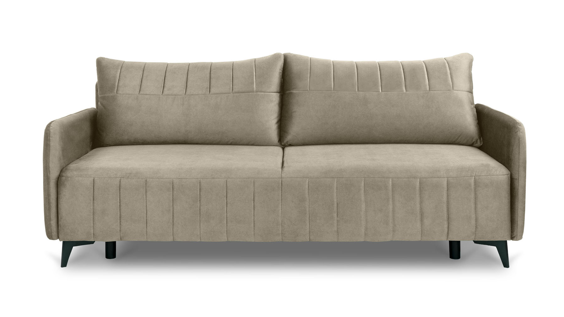 Nogi kanapy wykonane z wysokiej jakości plastiku gwarantują stabilność i łatwość utrzymania w czystości. Funkcja rozkładania, oferująca powierzchnię spania o wymiarach 140x193 cm, sprawia, że kanapa staje się praktycznym meblem do pomieszczeń gościnnych. Dodatkowo, praktyczny pojemnik na pościel ułatwia przechowywanie dodatkowych elementów, co czyni tę kanapę nie tylko stylowym, ale również funkcjonalnym dodatkiem do każdego wnętrza.