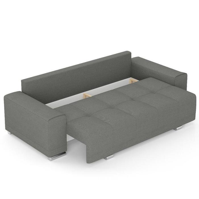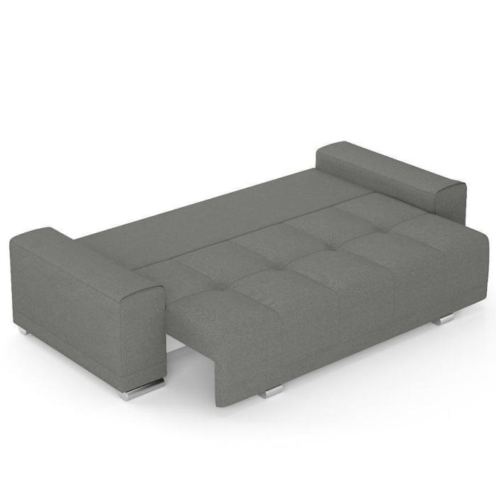 Kanapa Kevin w kolorze szarym to praktyczna i funkcjonalna kanapa zaprojektowana w nowoczesnym stylu. Mebel ten posiada funkcję okazjonalnego spania oraz praktyczny pojemnik na pościel. Po rozłożeniu powierzchnia spania wynosi 148x196 cm. System rozkładnia jest bardzo prosty- DL. Wypełnienie siedziska oraz oparcia mebla stanowią sprężyna falista, które zwiększają komfort podczas użytkowania. Świetnie sprawdzi się zarówno w salonie jak i pokoju dziennym.